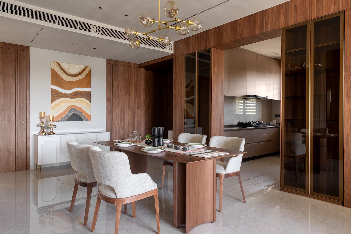 Designed by InC_Designs, this 2,000 sq ft show flat in Ahmedabad translates modern residential living into a calm, aspirational yet relatable spatial experience.