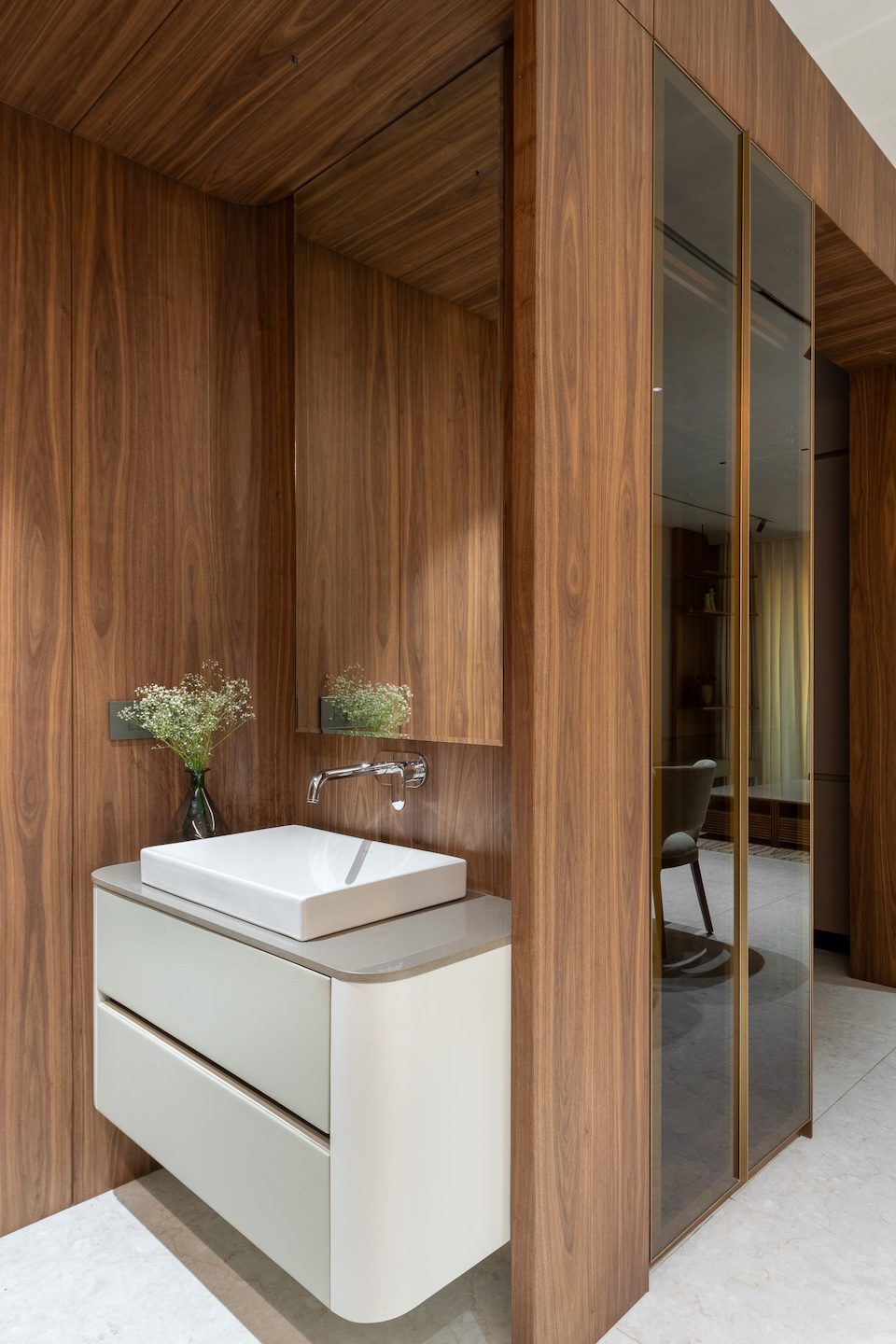 Civil changes were minimal and limited to integrating built-in furniture, wall panelling, and concealed services. The original apartment configuration was retained to ensure authenticity between the show flat and the actual units.