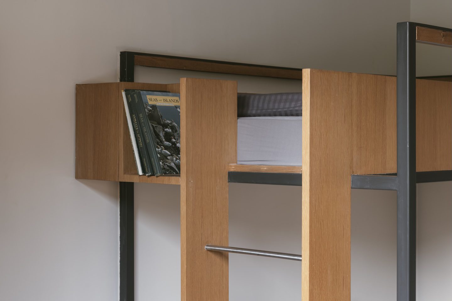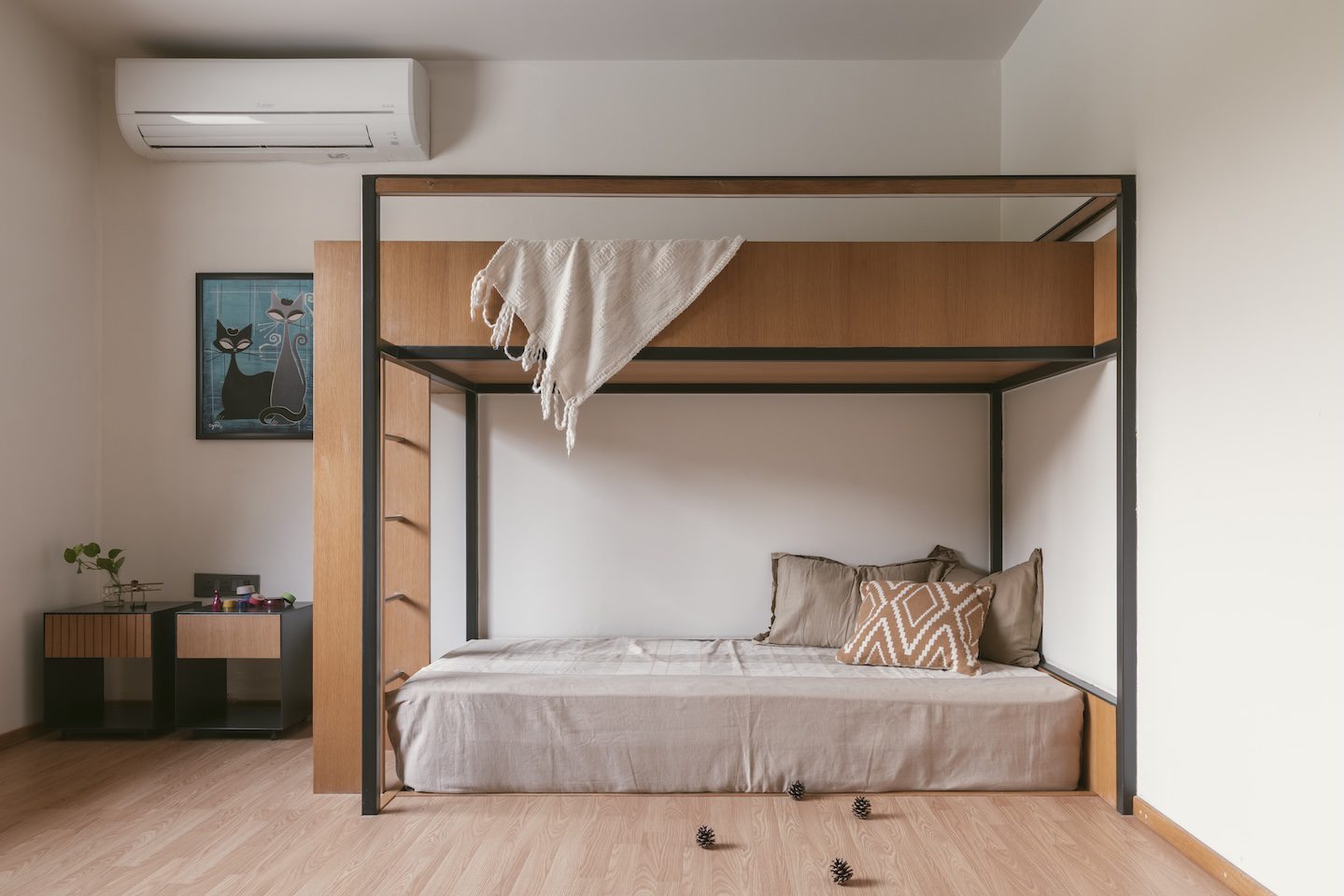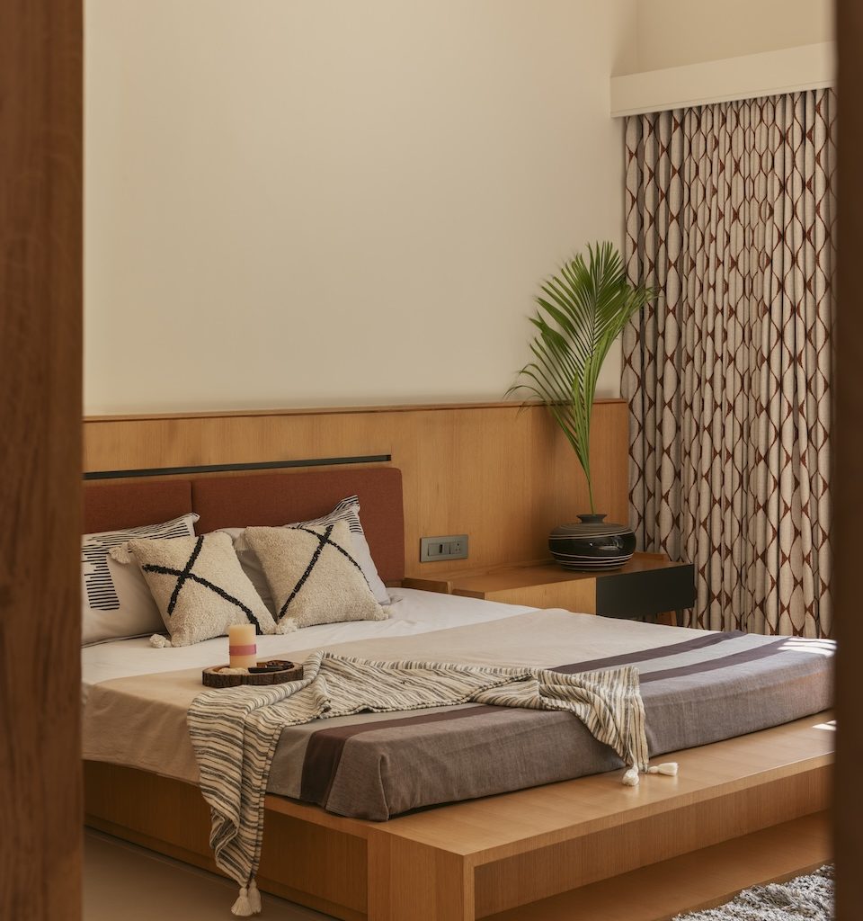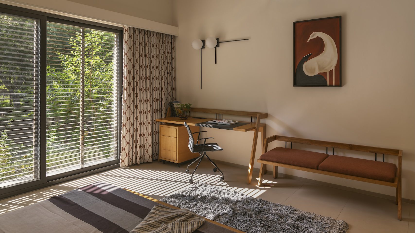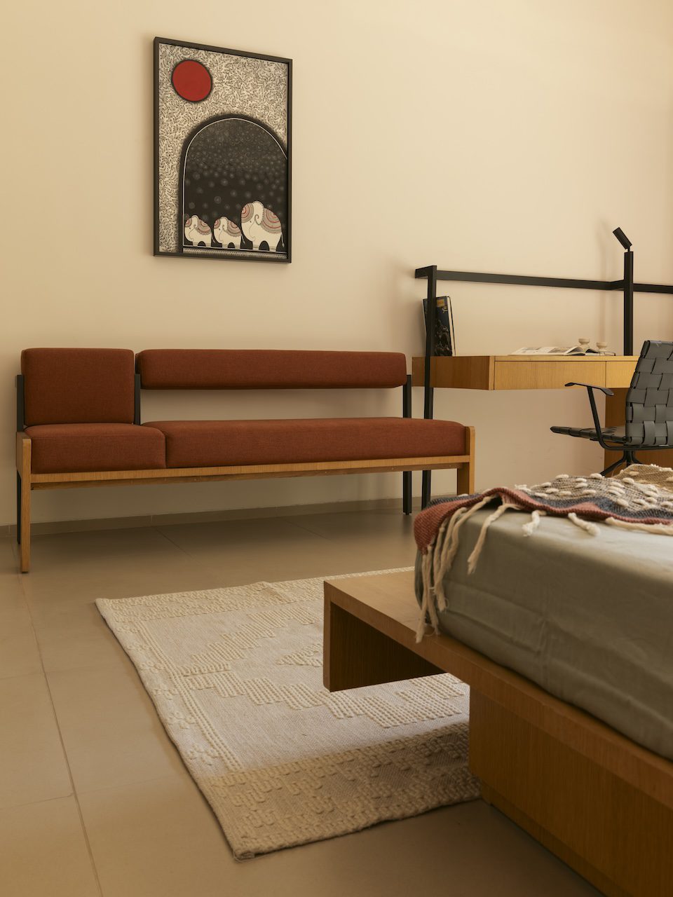 The second unit forms the private wing containing four bedrooms and an informal family lounge. Each bedroom carries a distinct identity through curated artwork and colour palettes reflecting the personality of its occupant. Despite these variations, filtered light, earthy textures, and restrained detailing unify the spaces into a cohesive environment of calm and comfort.