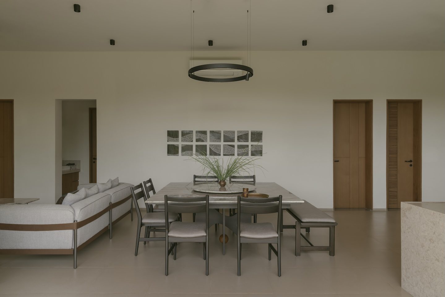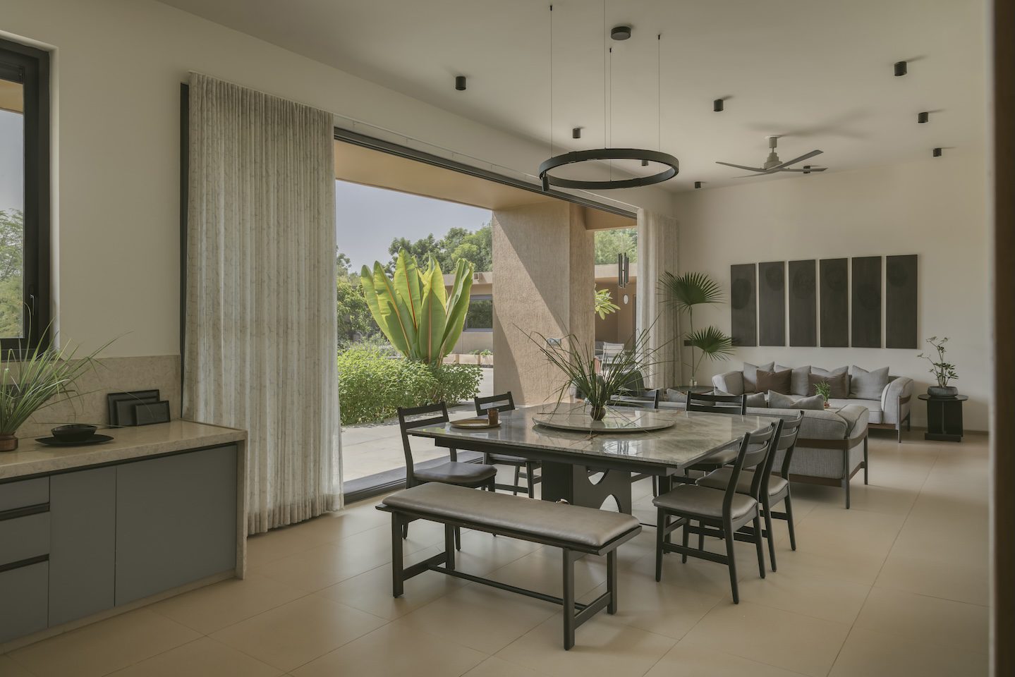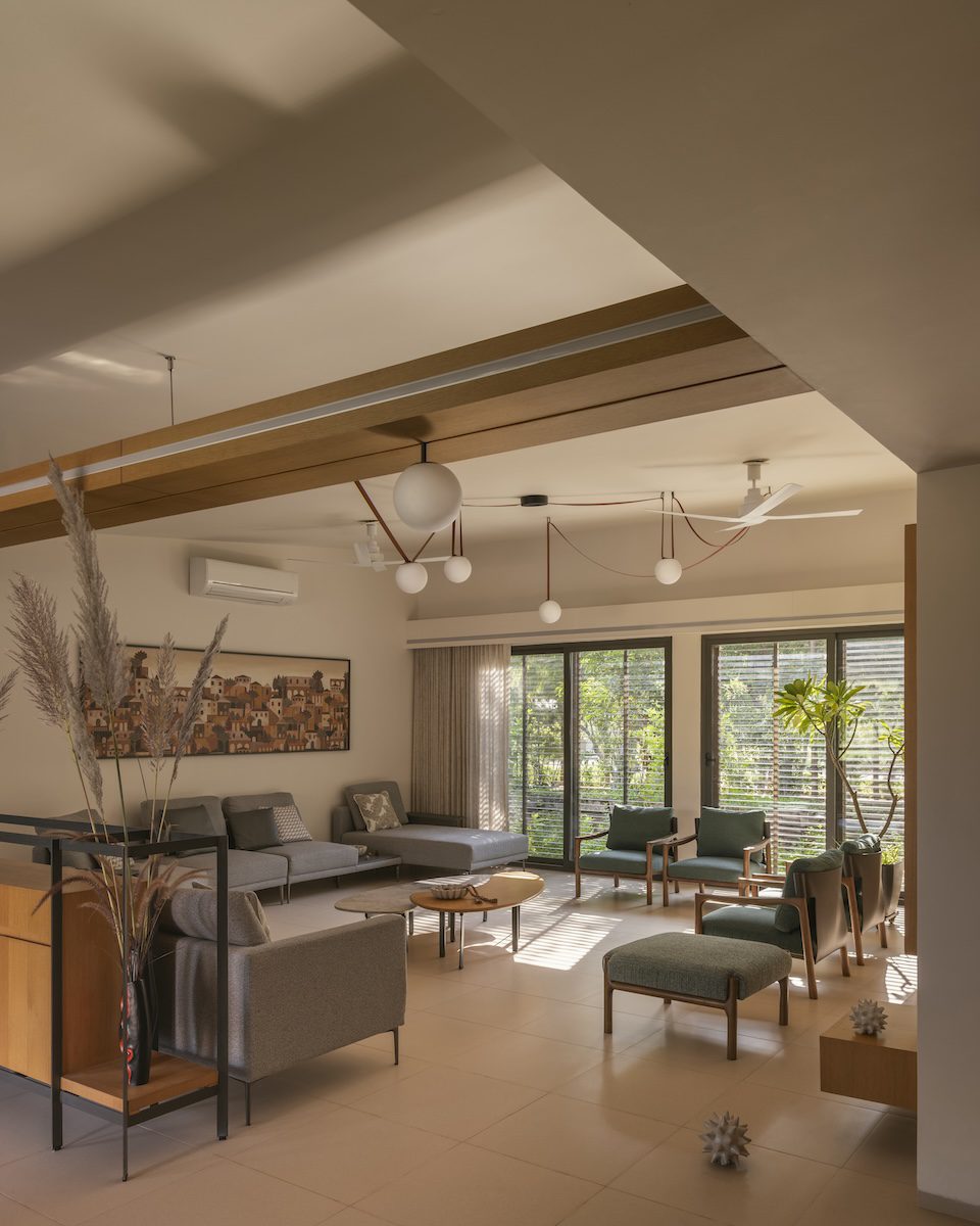 Designed by Salt Studio, this expansive family home on the outskirts of Ahmedabad is conceived as a calm, horizontally grounded retreat where nature, memory, and slow living shape everyday life.