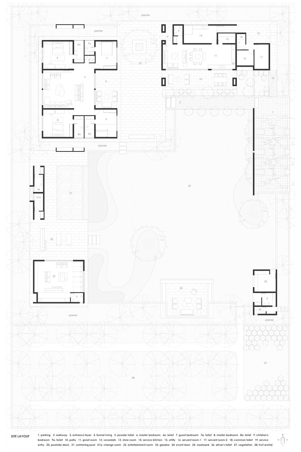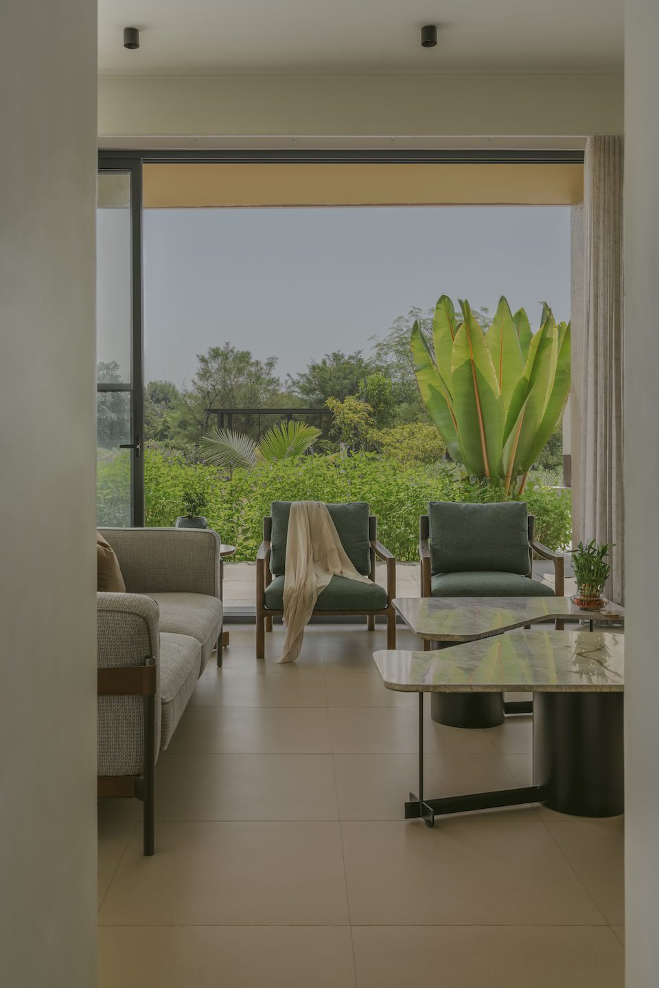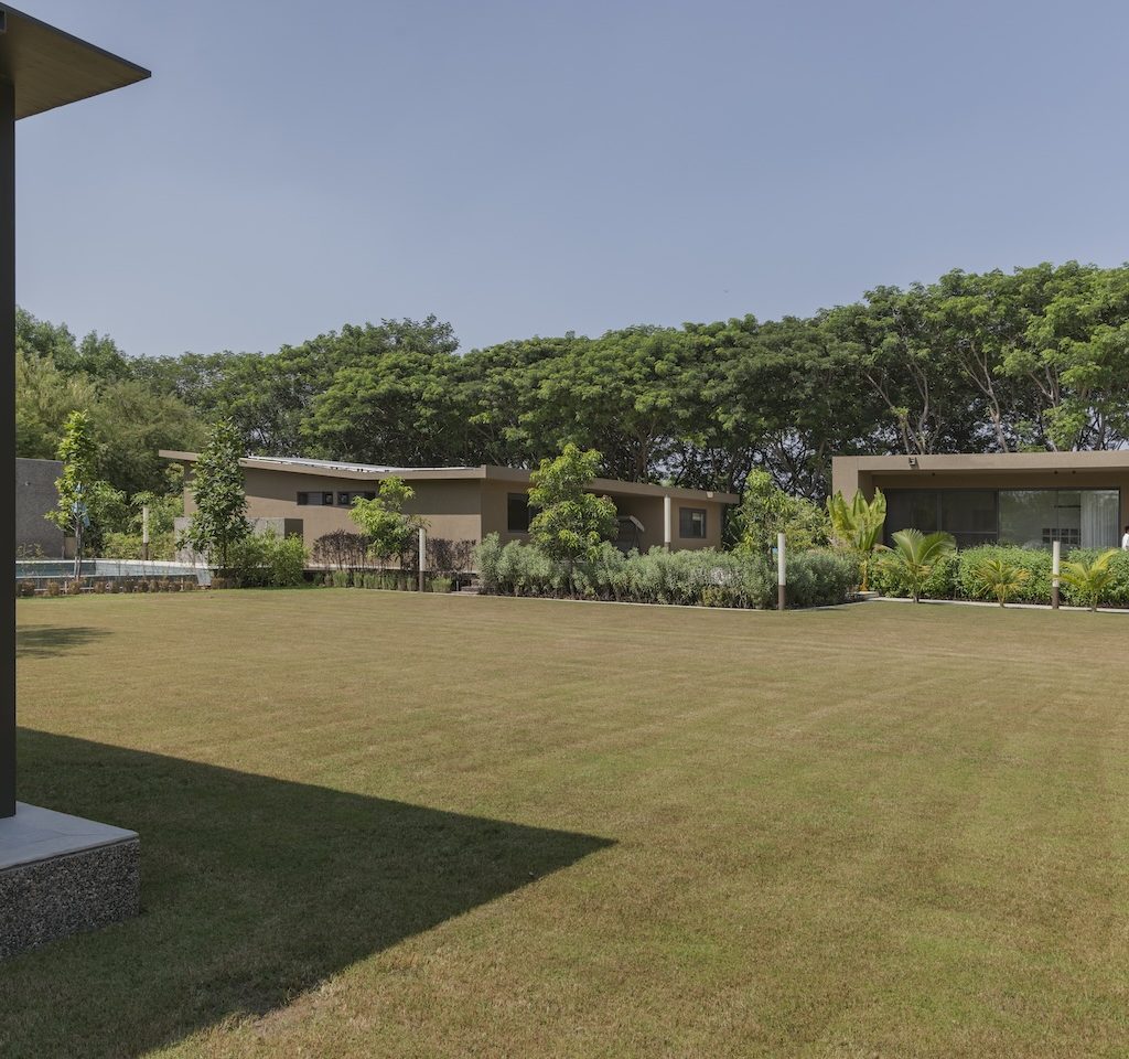 The project sits on a large plot formed by the combination of three parcels of land in the peri-urban outskirts of Ahmedabad near Kadi village. The surrounding area is part of a luxury weekend plotting development. Originally a vacant site with a lawn and peripheral trees, the plot allowed the architecture to remain horizontally grounded in accordance with local development regulations, reinforcing the idea of a retreat rather than a dominant built object. Access occurs via a quiet internal road, ensuring a calm residential environment.