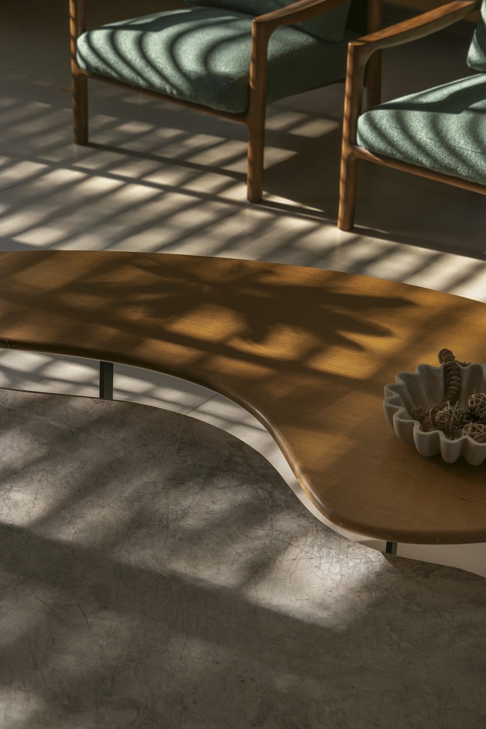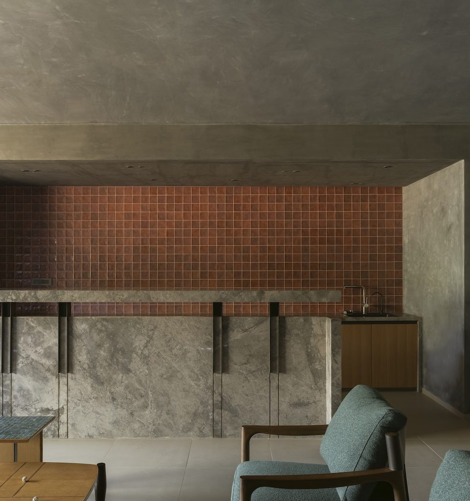 Large openings frame evolving views of the surrounding landscape, in the living-dining-kitchen unit, allowing daylight to function as an active design element. Muted materials, warm wood tones, and clean-lined furniture establish a timeless interior environment. A customised fingerprint artwork etched into seasoned wood records the unique imprint of each family member, transforming the space into a living archive of shared memory. Handmade ceramic tile artwork reflects the fluidity of the space and reinforces its communal character.