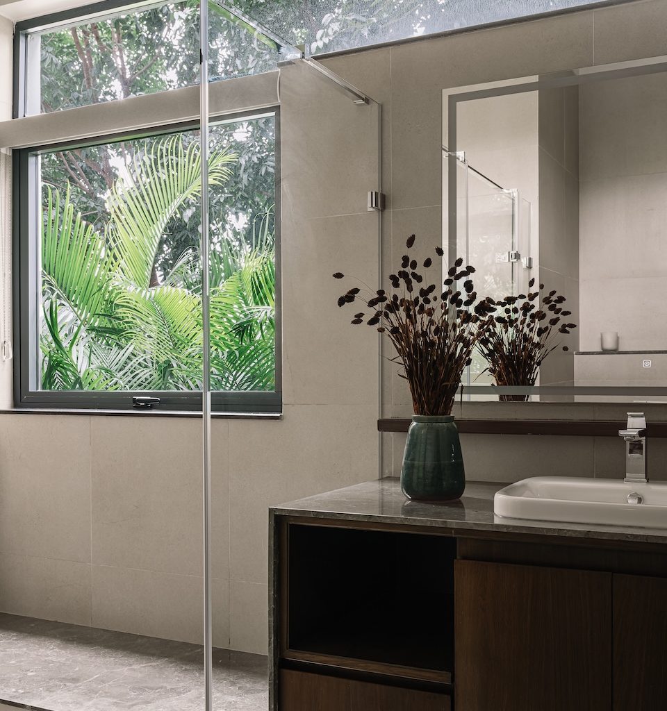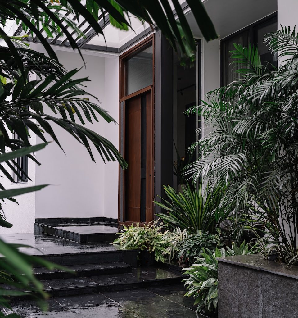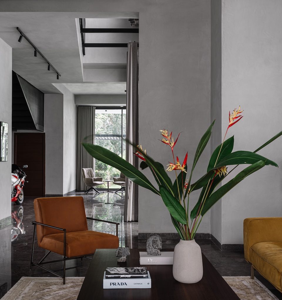 A landscape conceived by the studio leads visitors along a series of stone steps set against soft layers of greenery, gradually guiding them towards the entrance. Inside, the foyer opens in shades of grey, establishing an atmosphere that feels composed and deliberate. On one side, the informal living area, kitchen, and dining spaces flow into one another, forming a connected zone for everyday life and gatherings. On the other, the master bedroom and the formal living room (thoughtfully reimagined as a home office) anchor the quieter end of the residence.