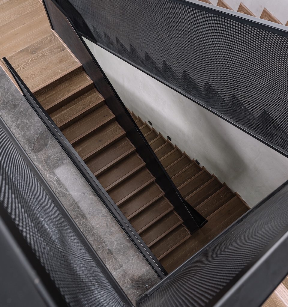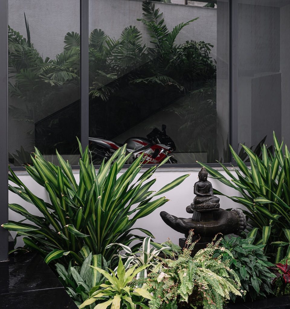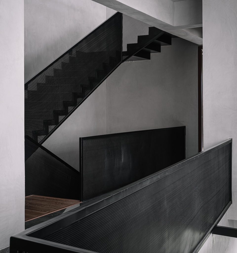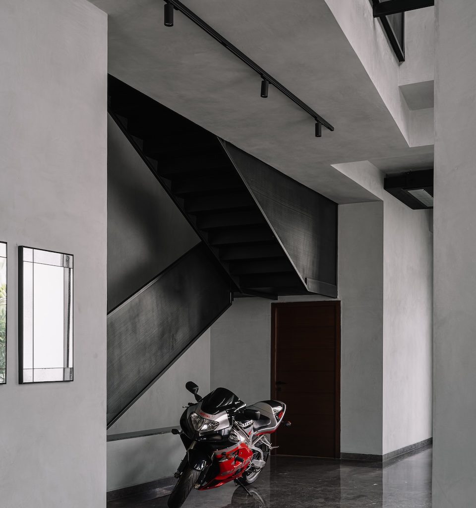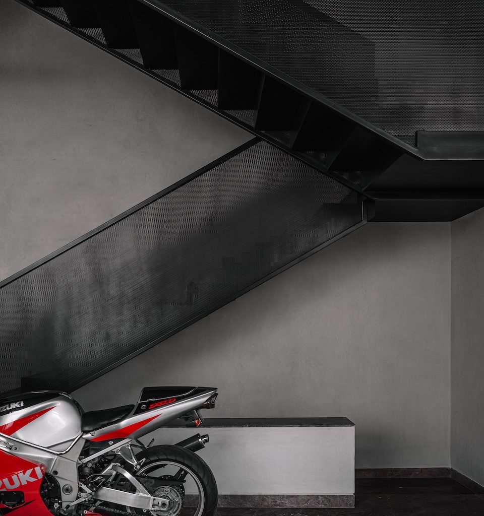 At the centre of the plan, a staircase rises as both circulation and focal point. Its black perforated metal railing introduces a graphic layer to the otherwise restrained material palette. Set against it is one of the homeowner’s prized possessions—a beloved motorcycle–displayed as a personal artefact that proudly narrates the client’s story within the architecture.