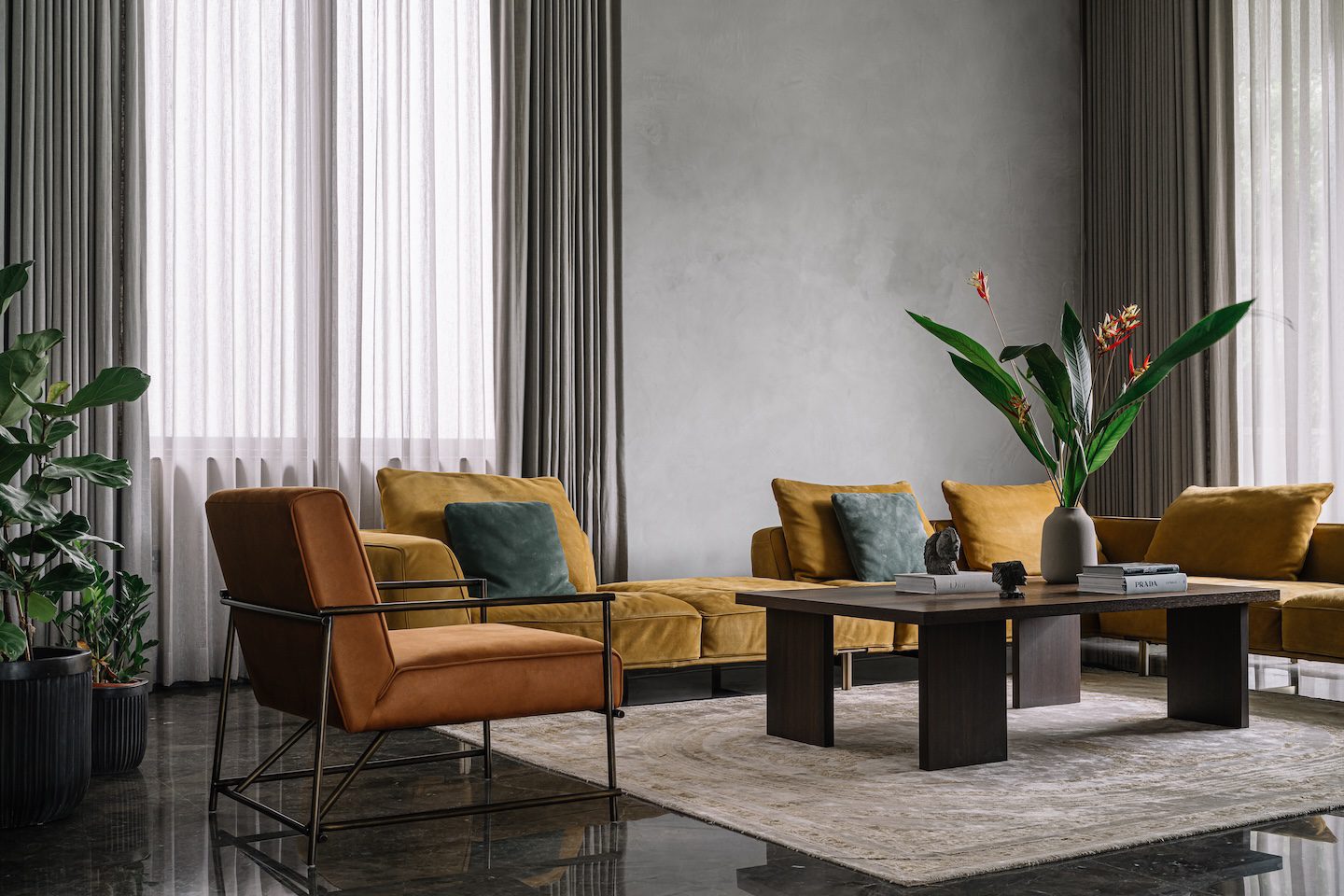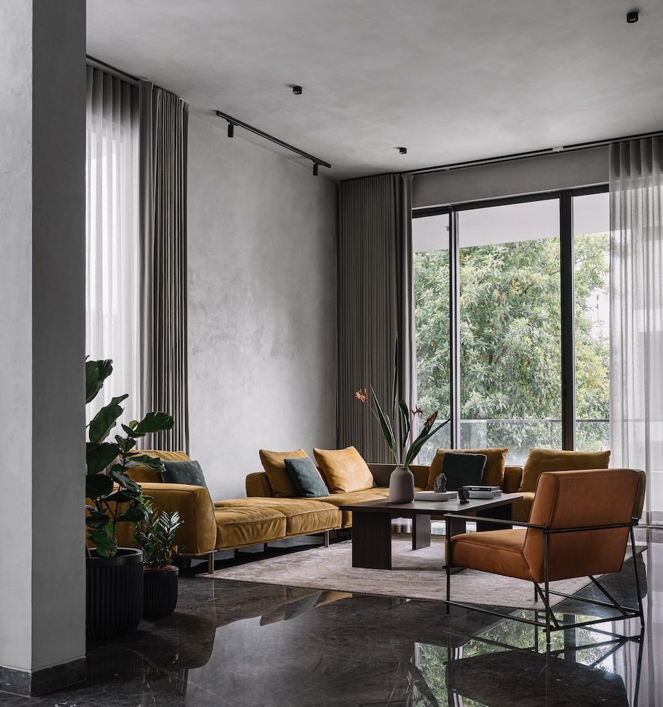 As one moves through the home, the material palette remains consistent tying the spaces together. In the informal living area, the greys continue to dominate but are gently punctuated with ochre and rust-toned upholstery. The kitchen and dining unfold as a unified zone, where charcoal-toned cabinetry and dark stone counters lend the space a sleek look. A minimalist dining table sits effortlessly within the layout. Interestingly, while the grey palette remains constant, its character shifts with the movement of light—appearing soft and silvery where sunlight filters in, and deeper and more atmospheric in shaded corners.
