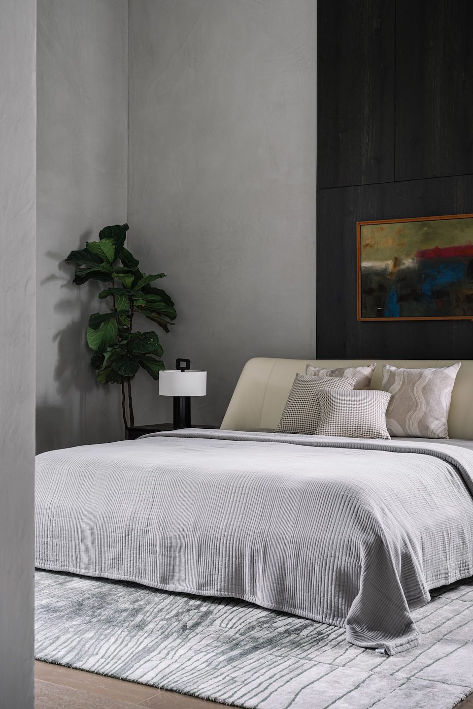 Deep-toned marble grounds the flooring, while textured grey concrete wraps the walls and extends to the 13-foot-high exposed ceilings. Rather than overwhelming the interiors, the concrete surfaces lend a softened sense of volume, allowing the architecture to feel expansive yet composed. Elsewhere, a thoughtful mix of metal, wood, and linen continues this narrative.