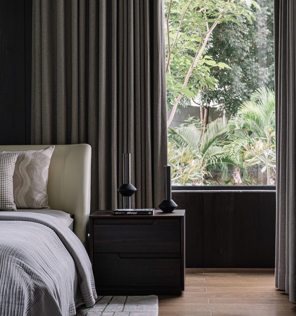 At the opposite end, the master bedroom is conceived as a calm retreat. Here, walnut wood flooring meets African blackwood panelling, grounding the room in rich natural tones. Concrete walls continue the home’s material narrative, while soft furnishings introduce a tactile layer that tempers the otherwise restrained palette.