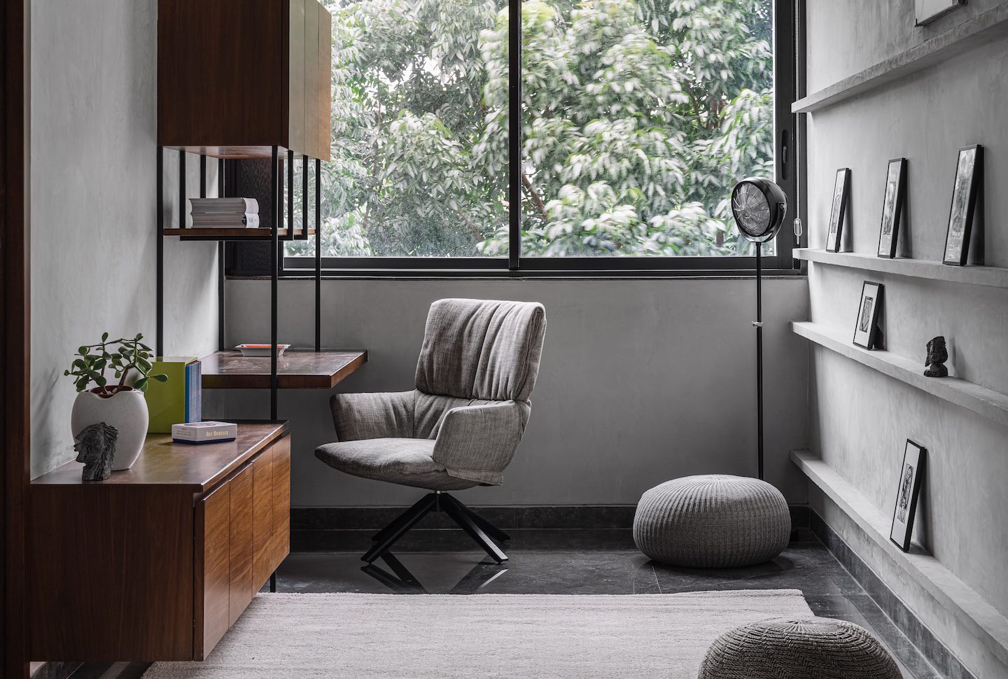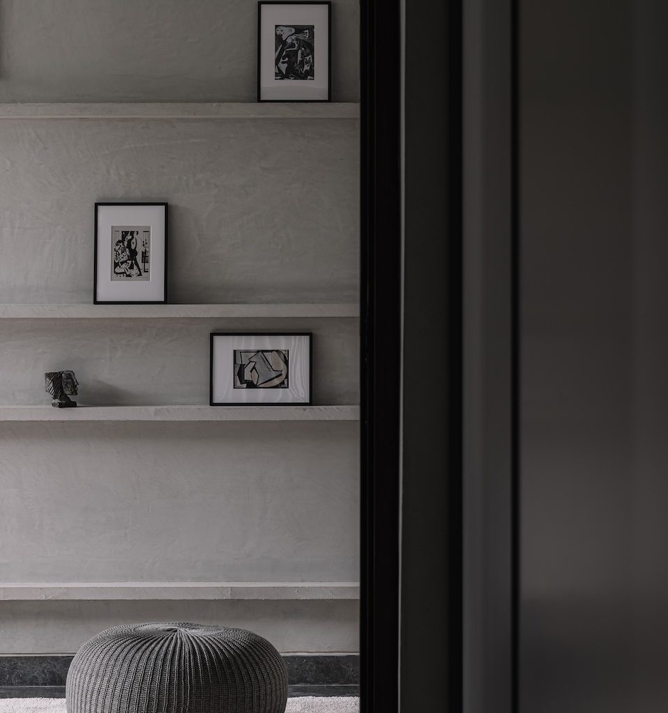 We fused the idea of a monochromatic palette with our studio’s signature understated aesthetic, while drawing subtle cues from industrial design,” Nilasha explains the design philosophy behind this project. The resulting palette relies on a measured composition of stone, metal, wood, and concrete, layered in neutral tones that challenge the notion of monochrome being stark or lifeless. Instead, the materials create a language of restraint where texture becomes the defining element.