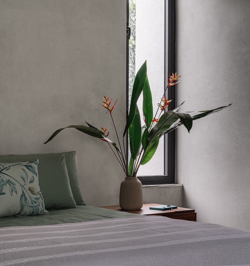Ascending the staircase reveals a small study nook which is framed with wood and metal shelving and washed with natural light. The corner carries a gentle warmth, making it an inviting place to pause or work. Adjacent to it lie two guest bedrooms, stripped of unnecessary embellishment and aligned with the home’s minimal language. In these room the grey envelope remains largely untouched, while linen introduces subtle personality: warm tan in one room and soft sage green in the other.