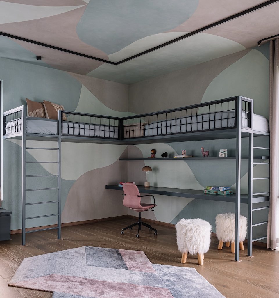 At the far end of the floor sits the daughters’ bedroom, offering a playful departure from the home’s otherwise muted palette. Designed with a camp-like spirit, the space features a bunk bed above and a study nook below. Industrial cues remain through the metal frame and rope railing, while a hand-painted mural by Studio Nilasha in grey, light blue, and teal sweeps across the walls and ceiling, energising the room. Dusty rose accents, introduced through the chair and small objects, complete the palette with a gentle harmony.
