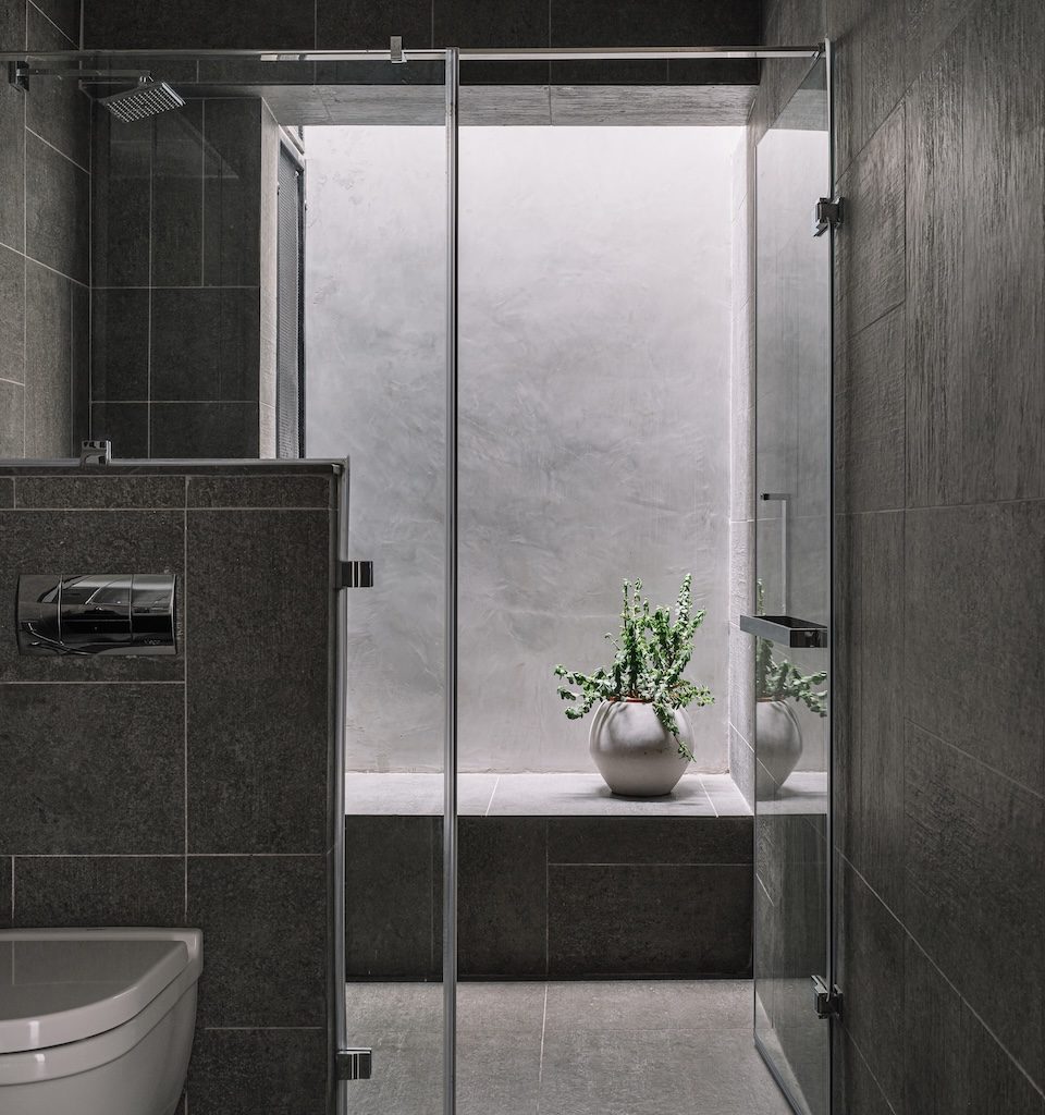 To temper the moody palette, strategic openings were introduced early in the design process to invite daylight and views of the surrounding landscape into the home. This careful orchestration of light allows the grey of concrete converse with the green outdoors. Across the house, the connection to nature becomes a subtle but constant presence, as if each room opens itself gently to the landscape beyond.