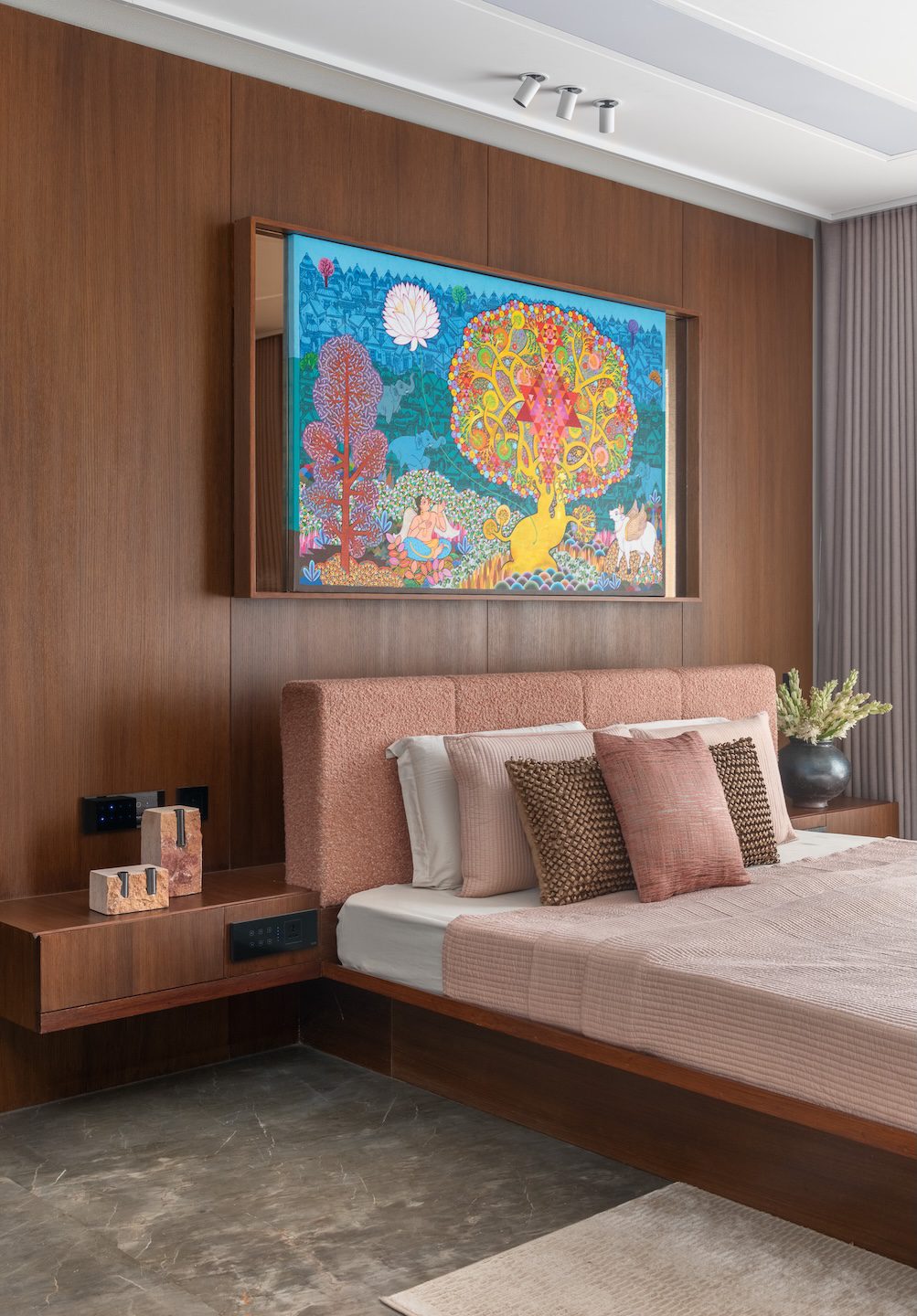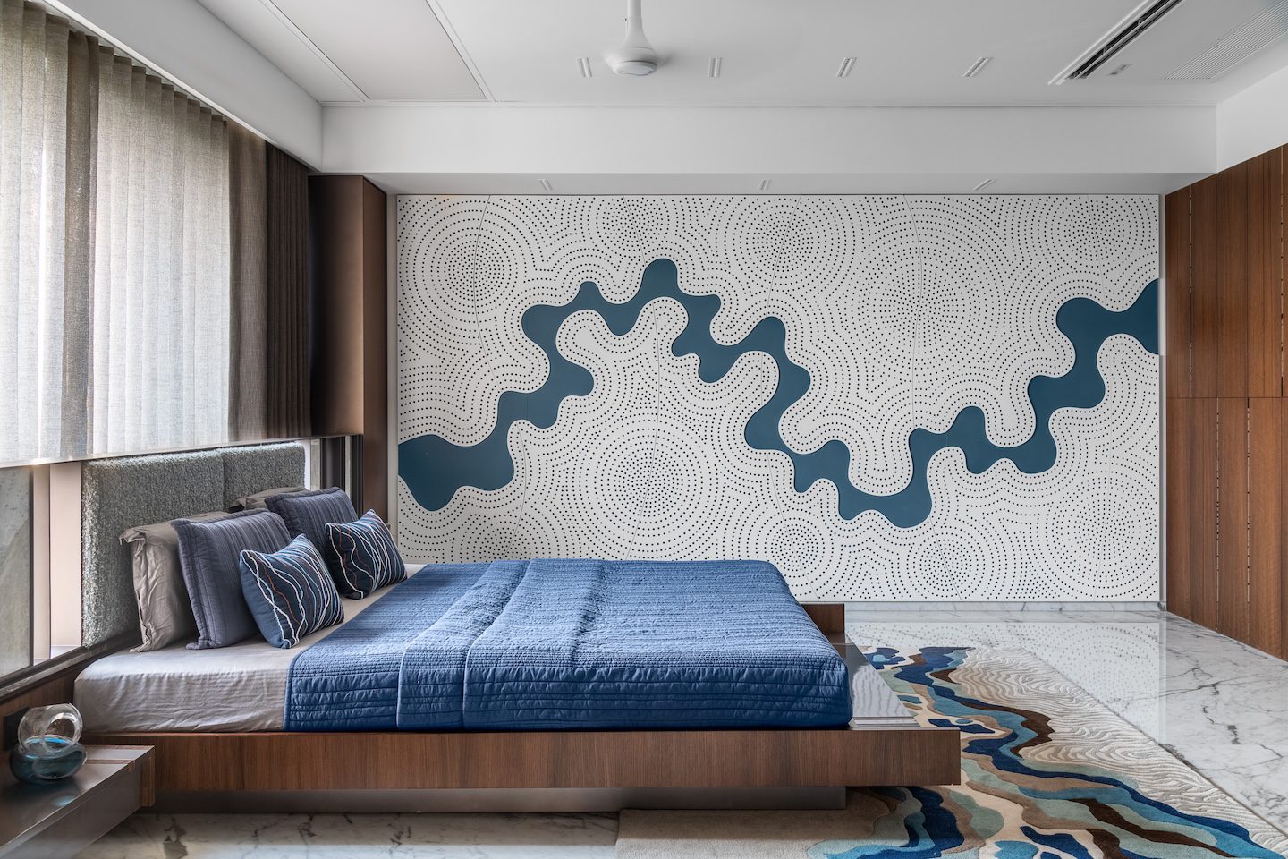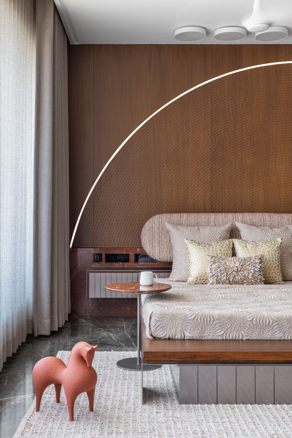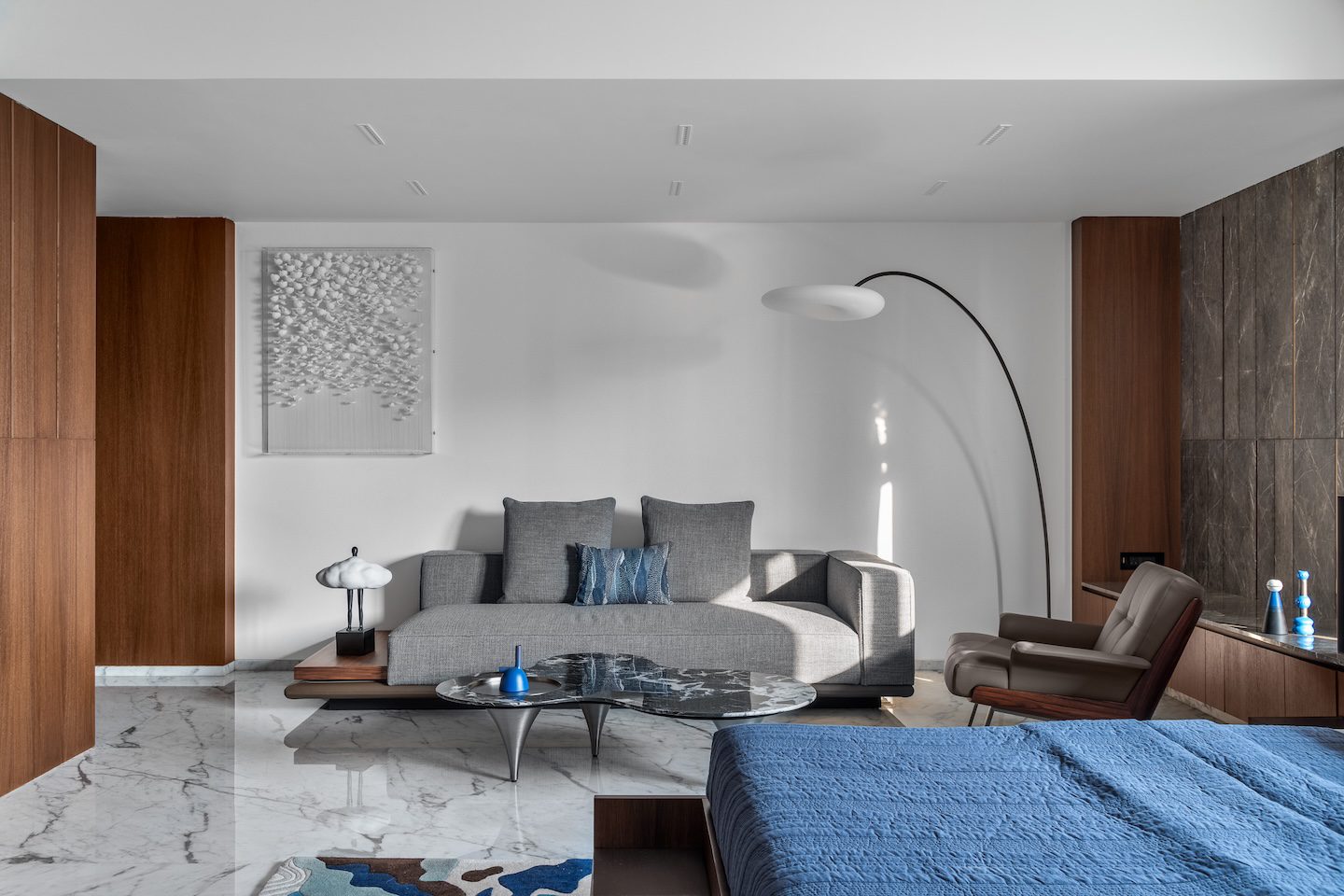 The circular staircase within the double-height living room stands out as the project’s most striking spatial feature—both a functional element and a sculptural centrepiece. Equally significant is the marble-clad wall that frames the living space, introducing a strong architectural gesture without overwhelming the minimalist composition. Across the bedrooms, subtle variations in colour, artworks and finishes allow each room to reflect the preferences of its occupants while remaining consistent with the home’s overarching design vocabulary.
