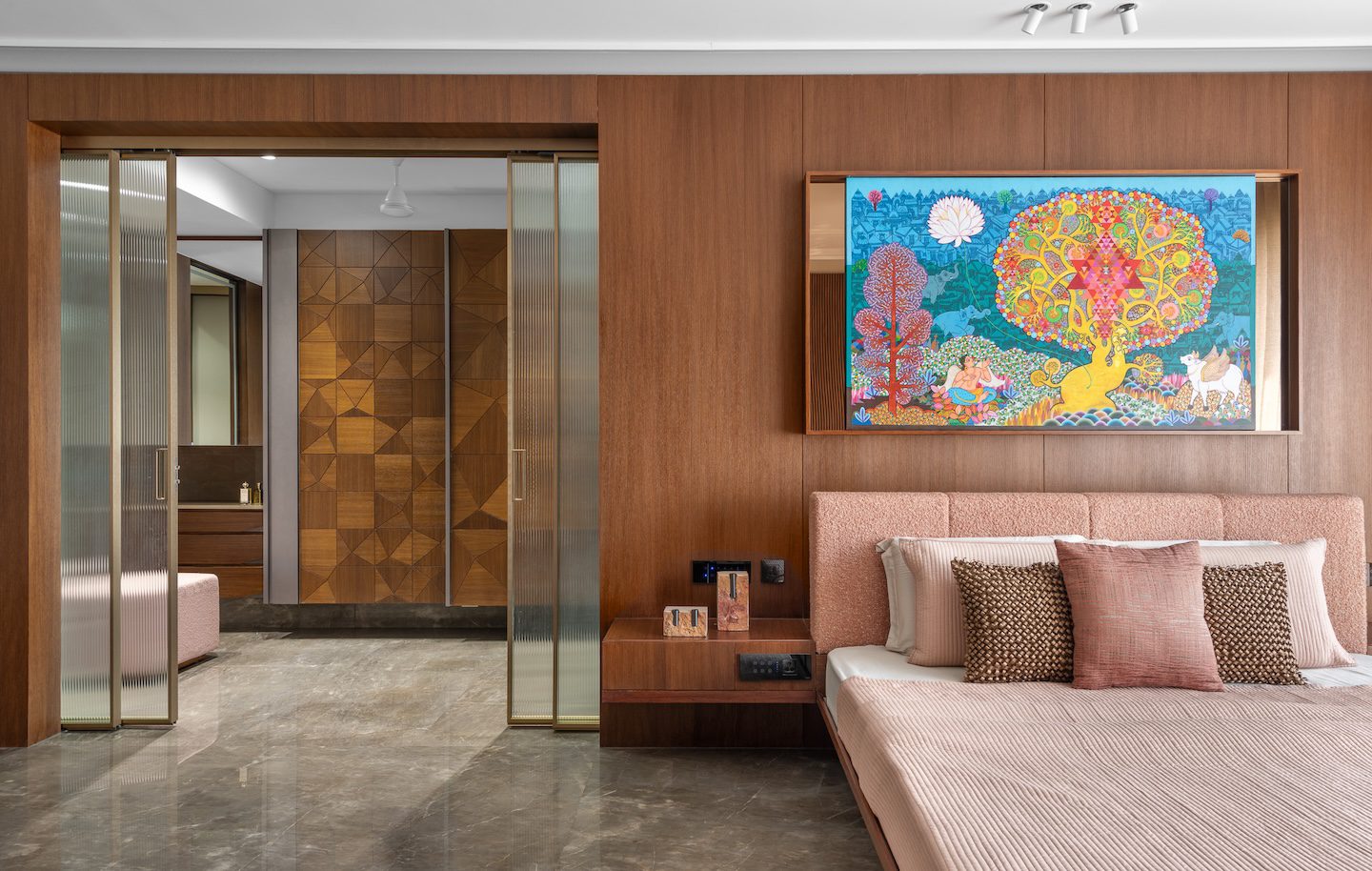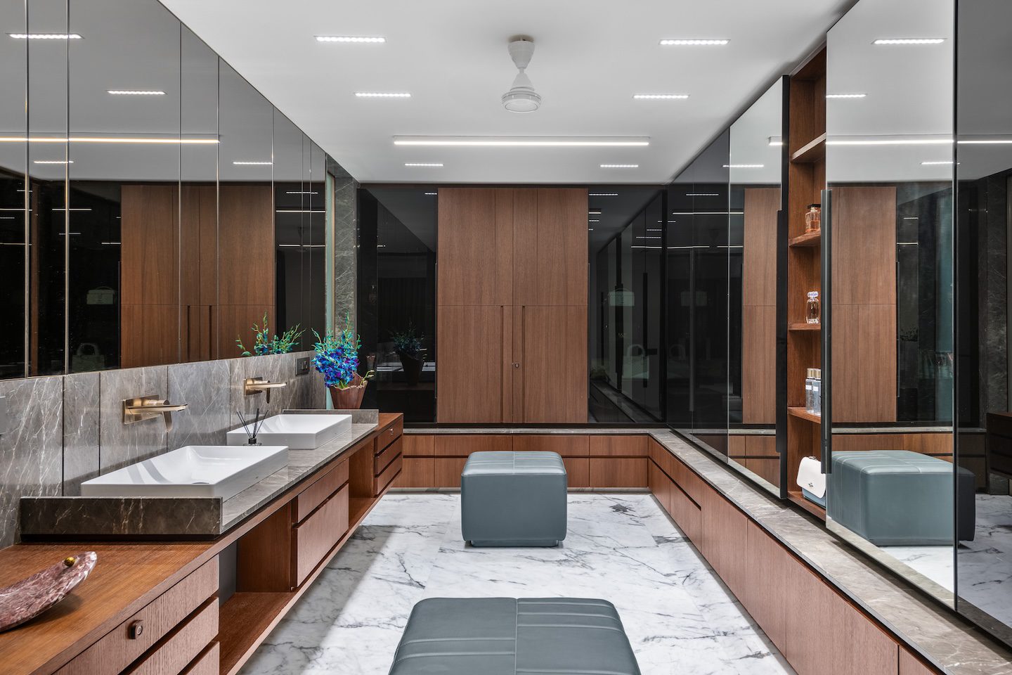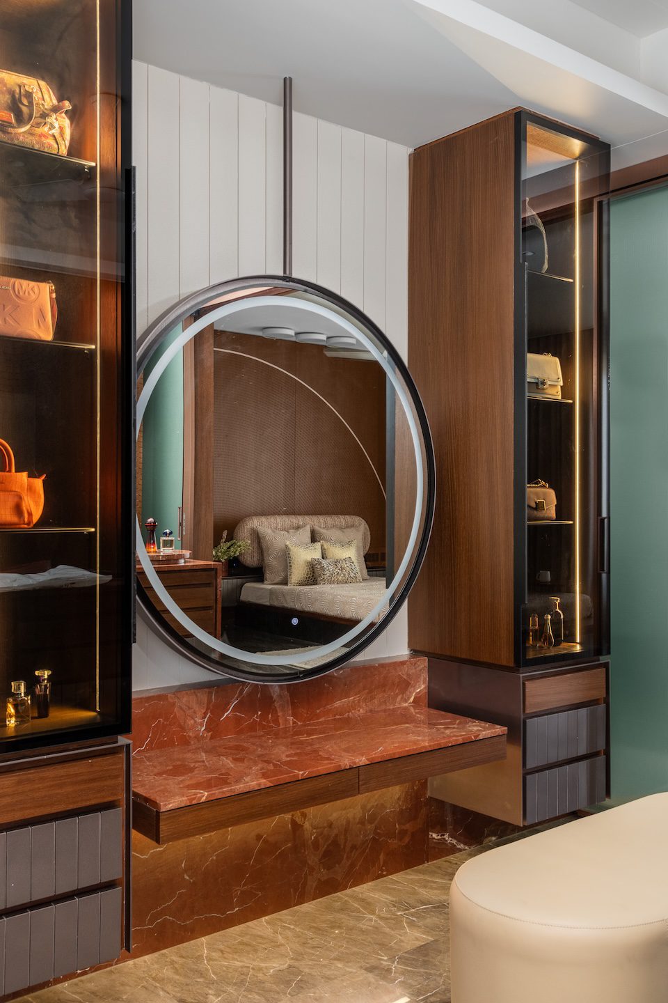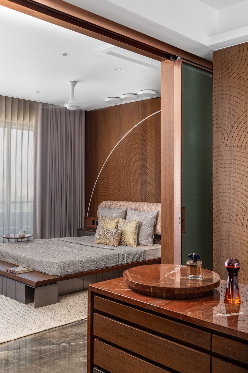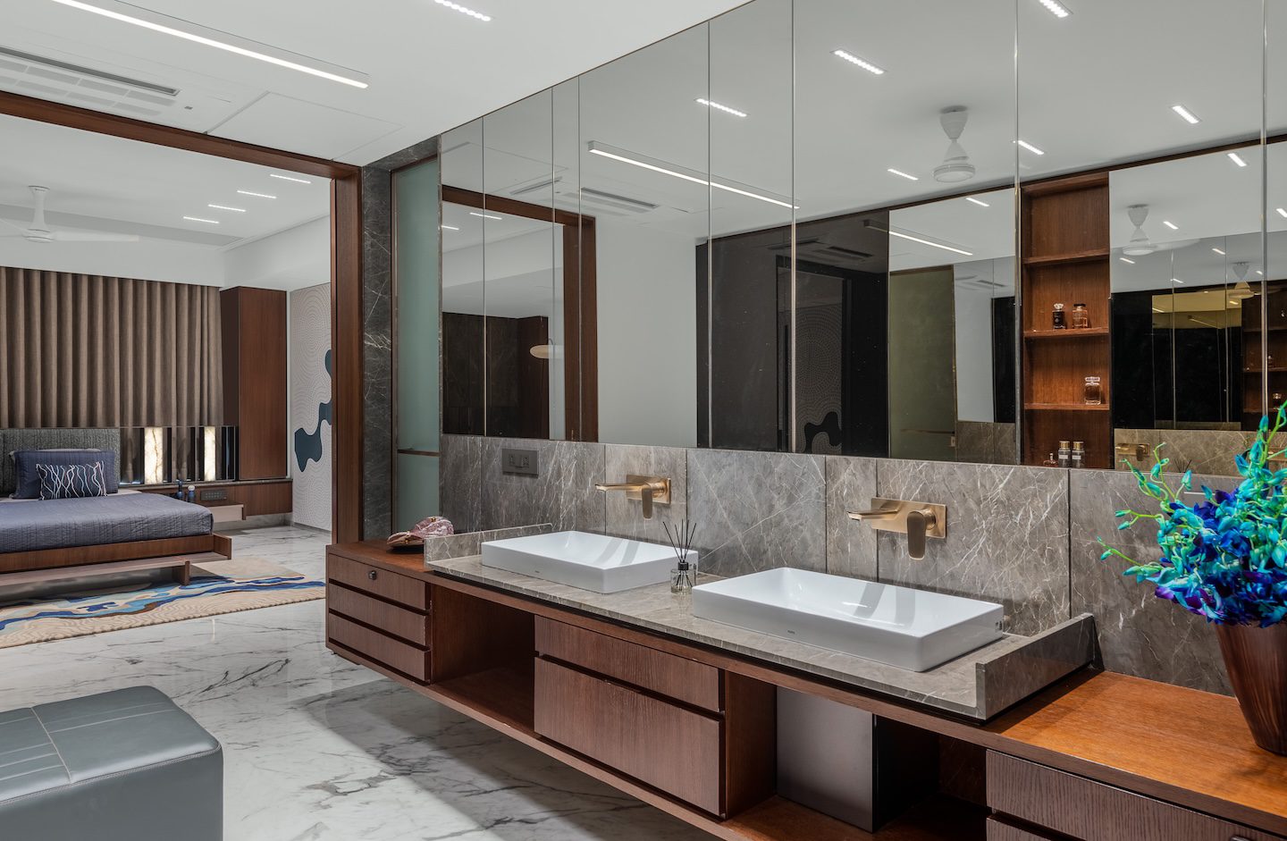 The design strategy focused on opening up the apartment’s internal structure while allowing materials and architectural elements to carry the visual narrative. Rather than compartmentalising spaces, the designers sought to create rooms that feel connected to one another through long sightlines and controlled transitions. Bedrooms were planned so that wardrobe and washroom areas integrate more seamlessly with the sleeping spaces, giving each room a more open and expansive character.