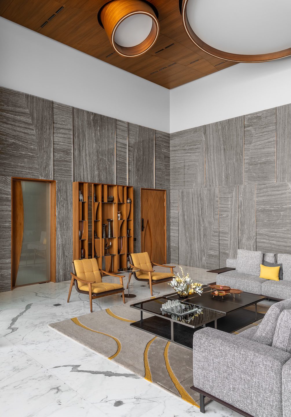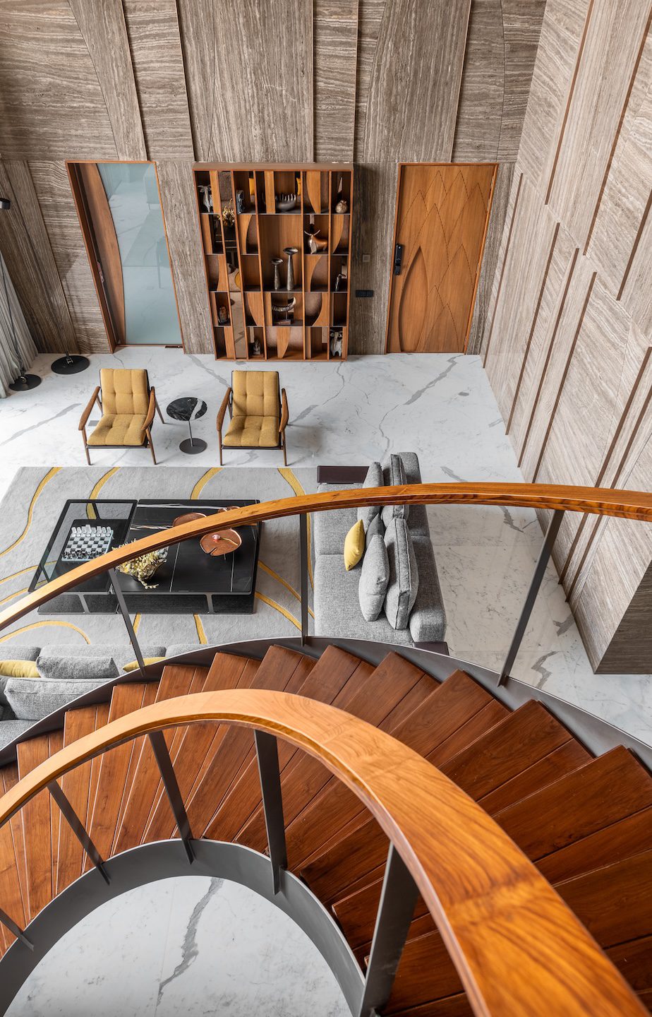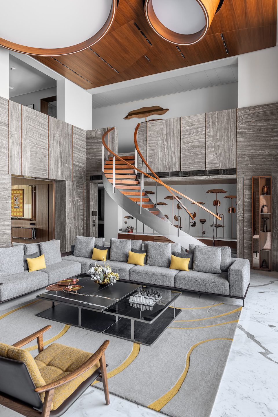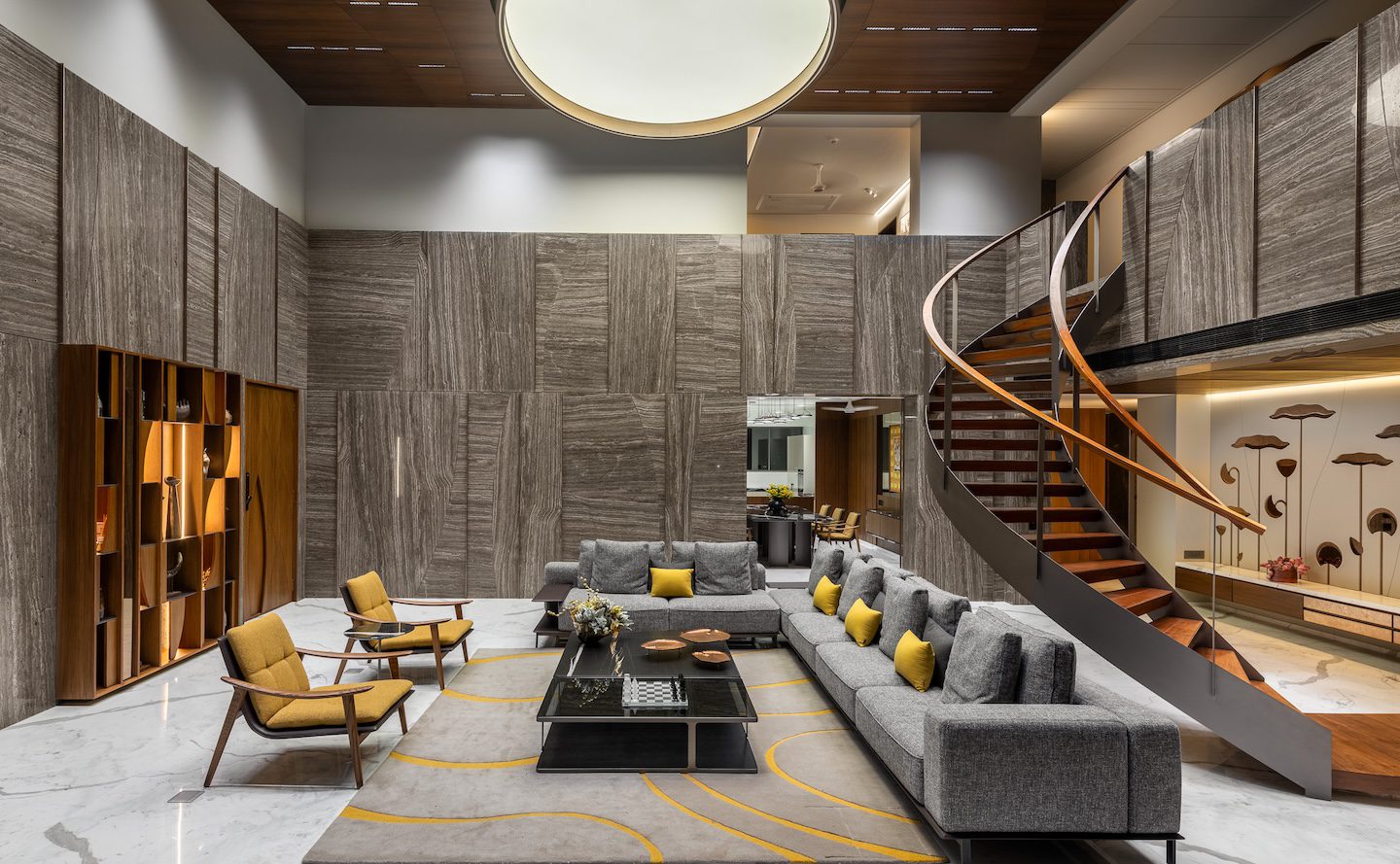 Within the double-height living room, a C-shaped marble-clad wall wraps around three sides of the space, visually tying together the otherwise fragmented volume created by multiple openings. This element introduces warmth and cohesion while anchoring the expansive living area.