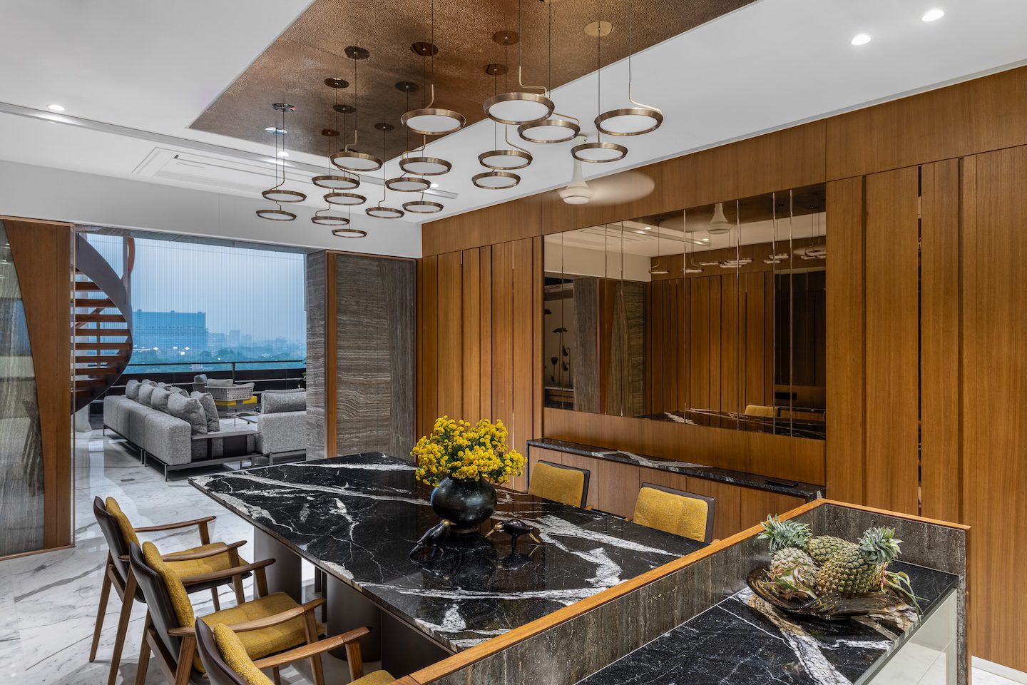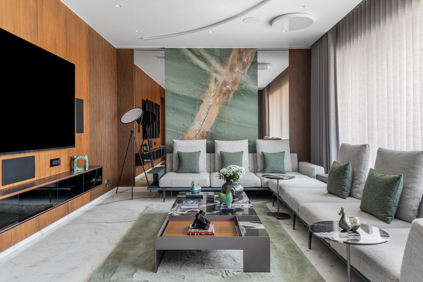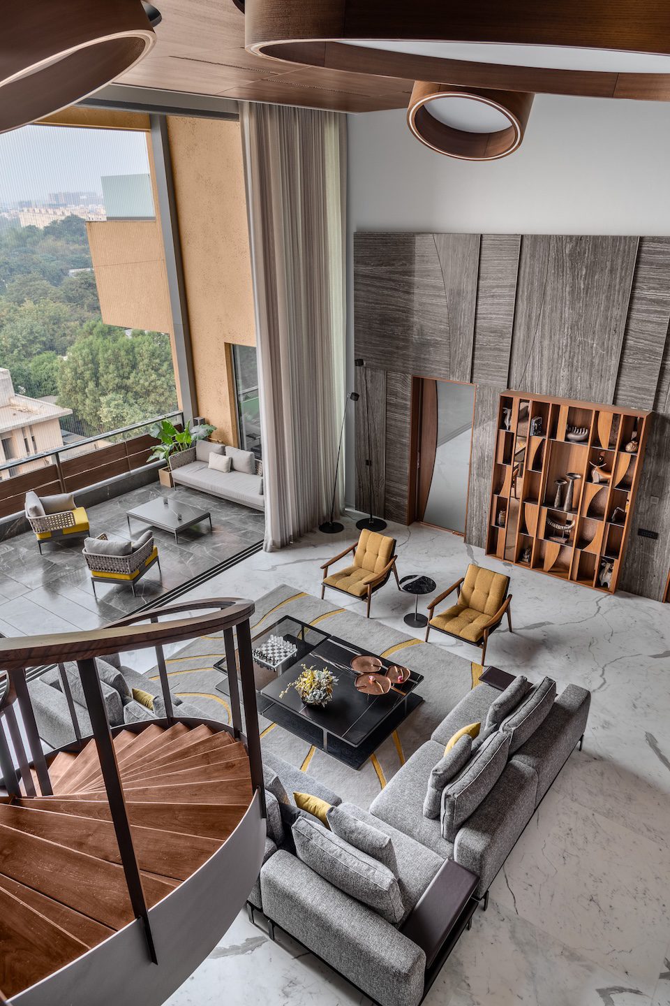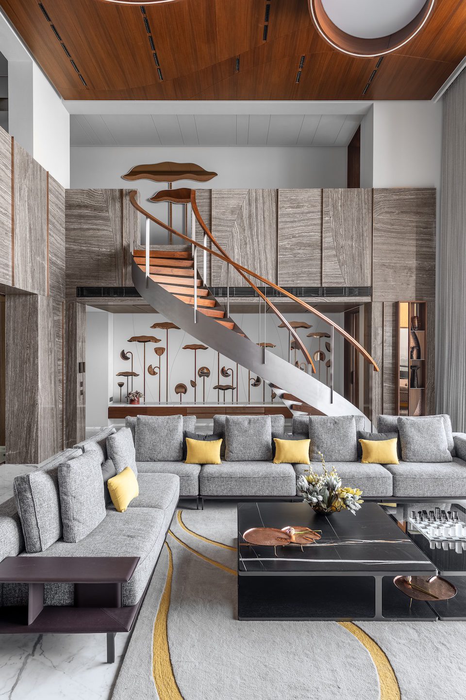 Within the double-height living room, a C-shaped marble-clad wall wraps around three sides of the space, visually tying together the otherwise fragmented volume created by multiple openings. This element introduces warmth and cohesion while anchoring the expansive living area.
