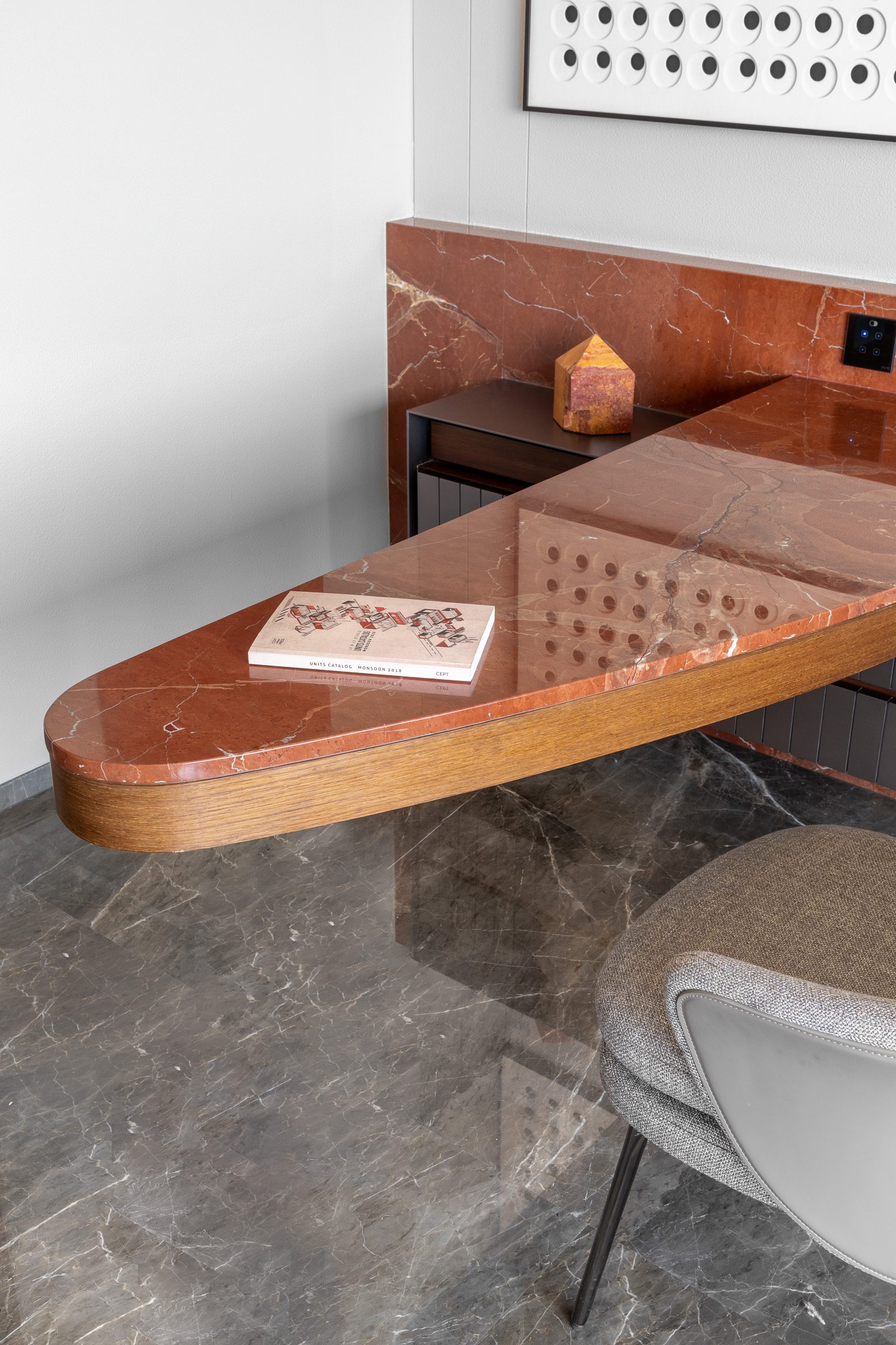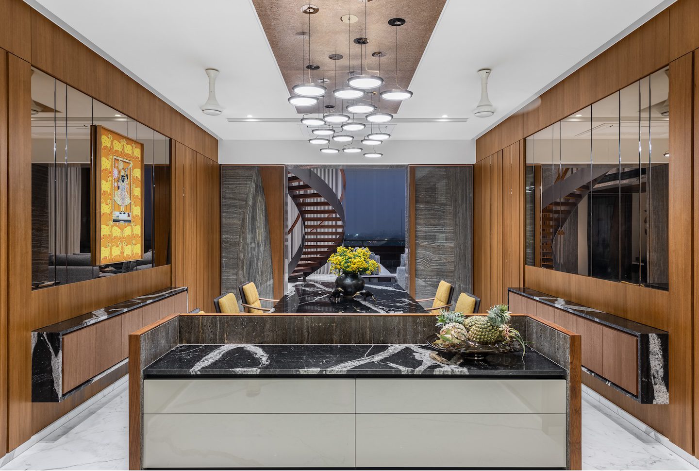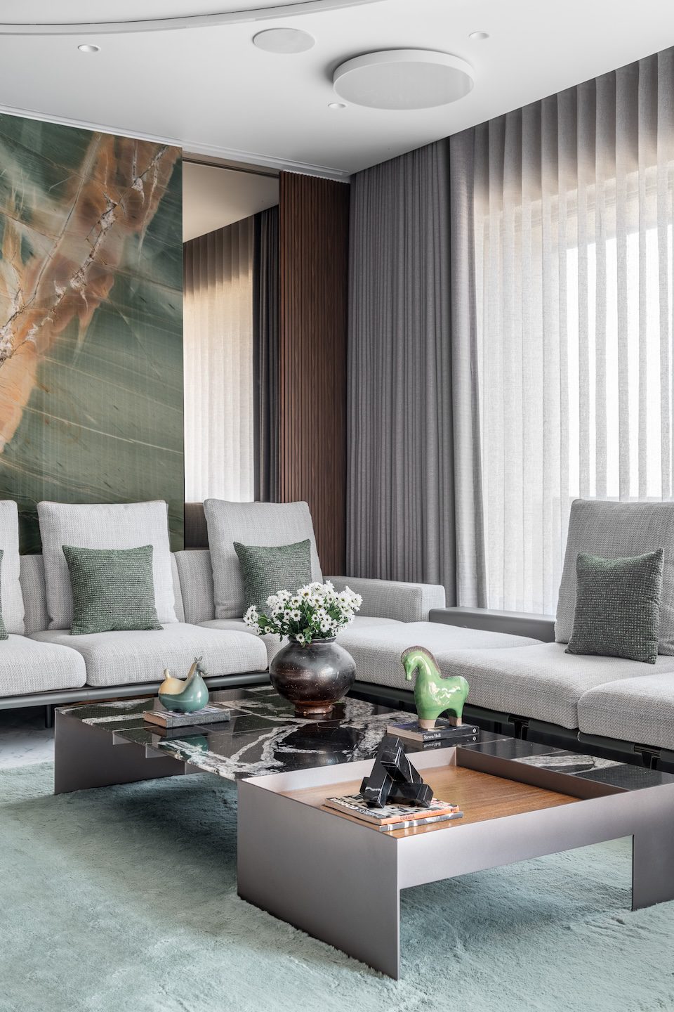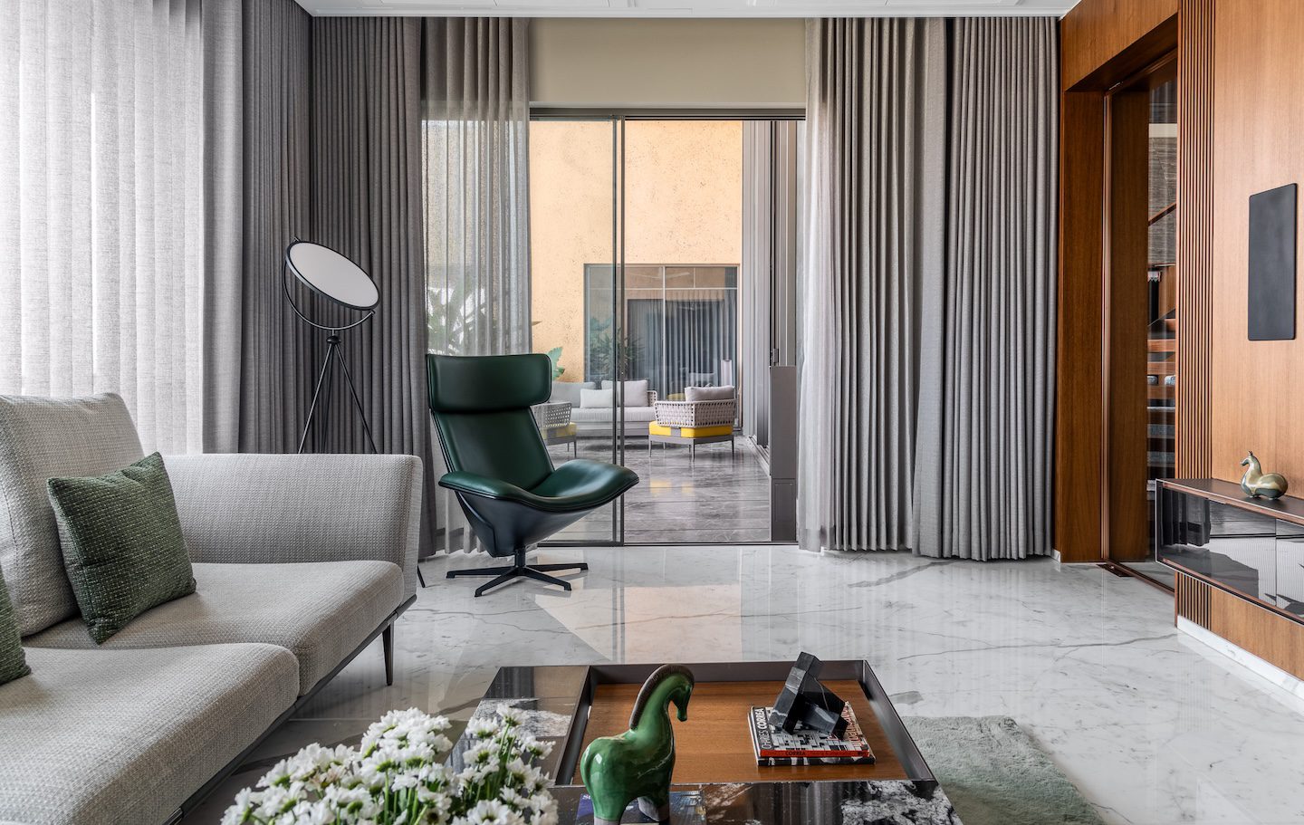 Within the double-height living room, a C-shaped marble-clad wall wraps around three sides of the space, visually tying together the otherwise fragmented volume created by multiple openings. This element introduces warmth and cohesion while anchoring the expansive living area.
