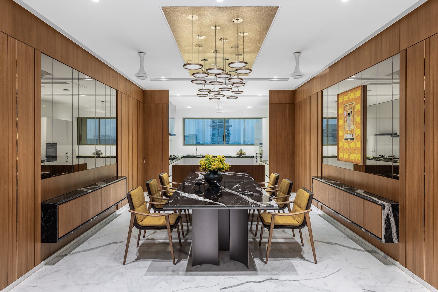 Material selection forms the backbone of the project’s understated luxury. Marble flooring, granite countertops, marble wall cladding and refined textiles establish a palette that is both timeless and tactile.