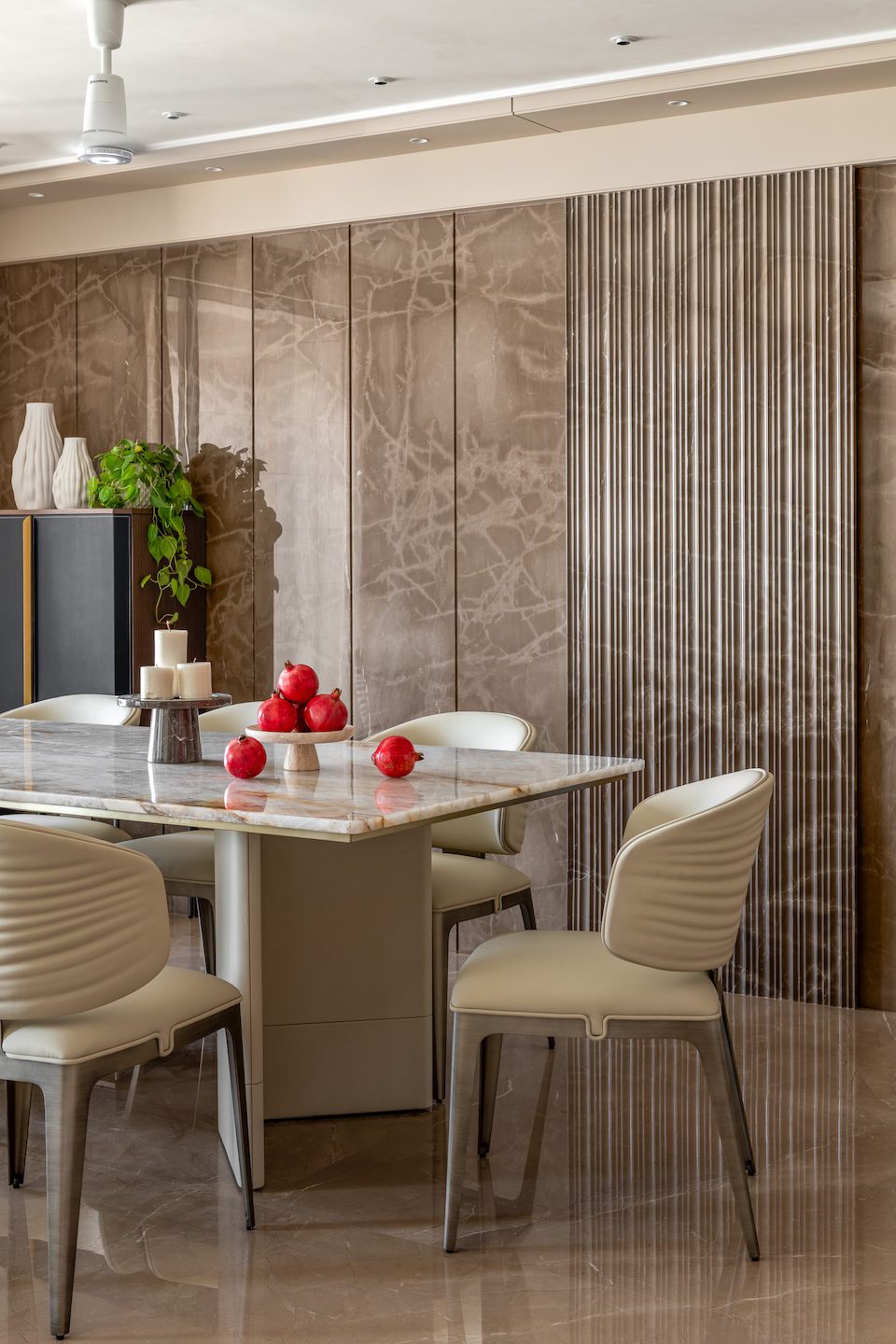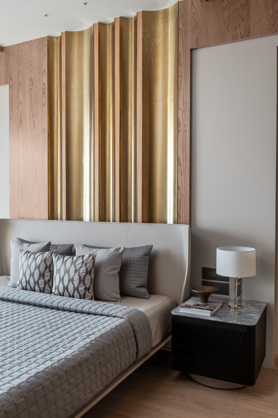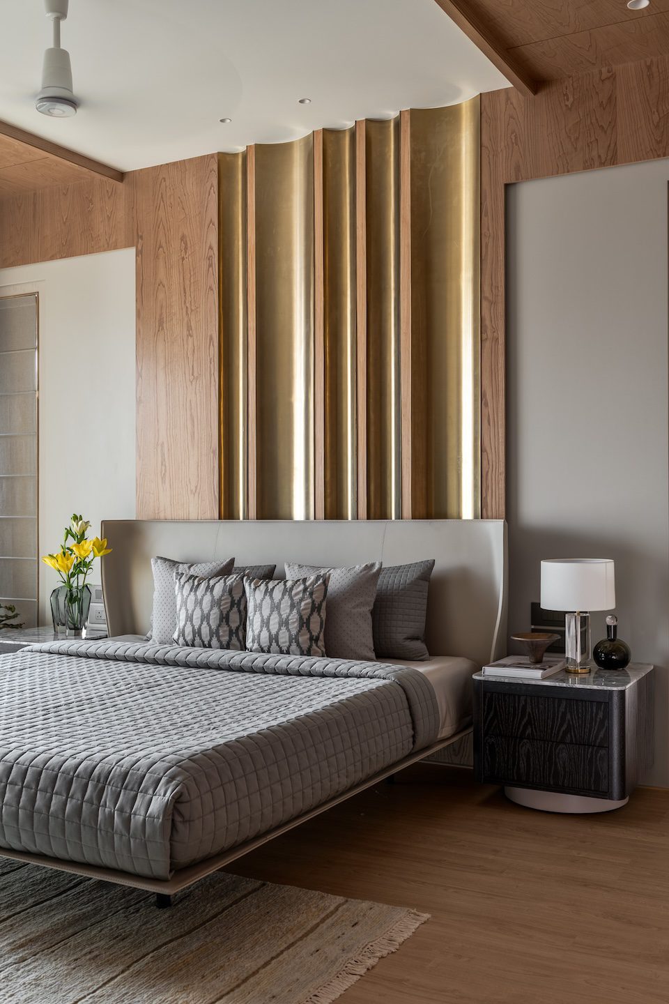 Texture and material transitions form the central theme of the project. Fluted stone walls in the dining area and rhythmic timber panelling in the master bedroom introduce layers of visual depth while maintaining overall restraint. The design carefully juxtaposes contrasting materials—stone, wood and metal—allowing each to complement the other through subtle transitions. As architect Amit Shastri explains, “True luxury lies in the transition between materials; the point where cold stone meets warm wood is where a house becomes a home.” Rather than decorative embellishment, these controlled material relationships become the primary design gesture throughout the residence.