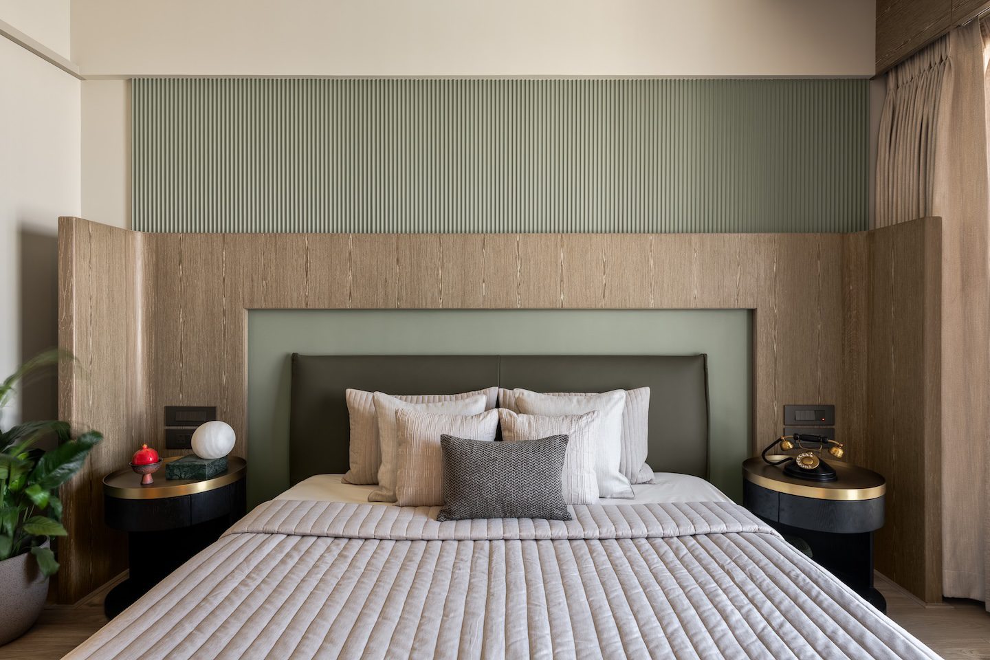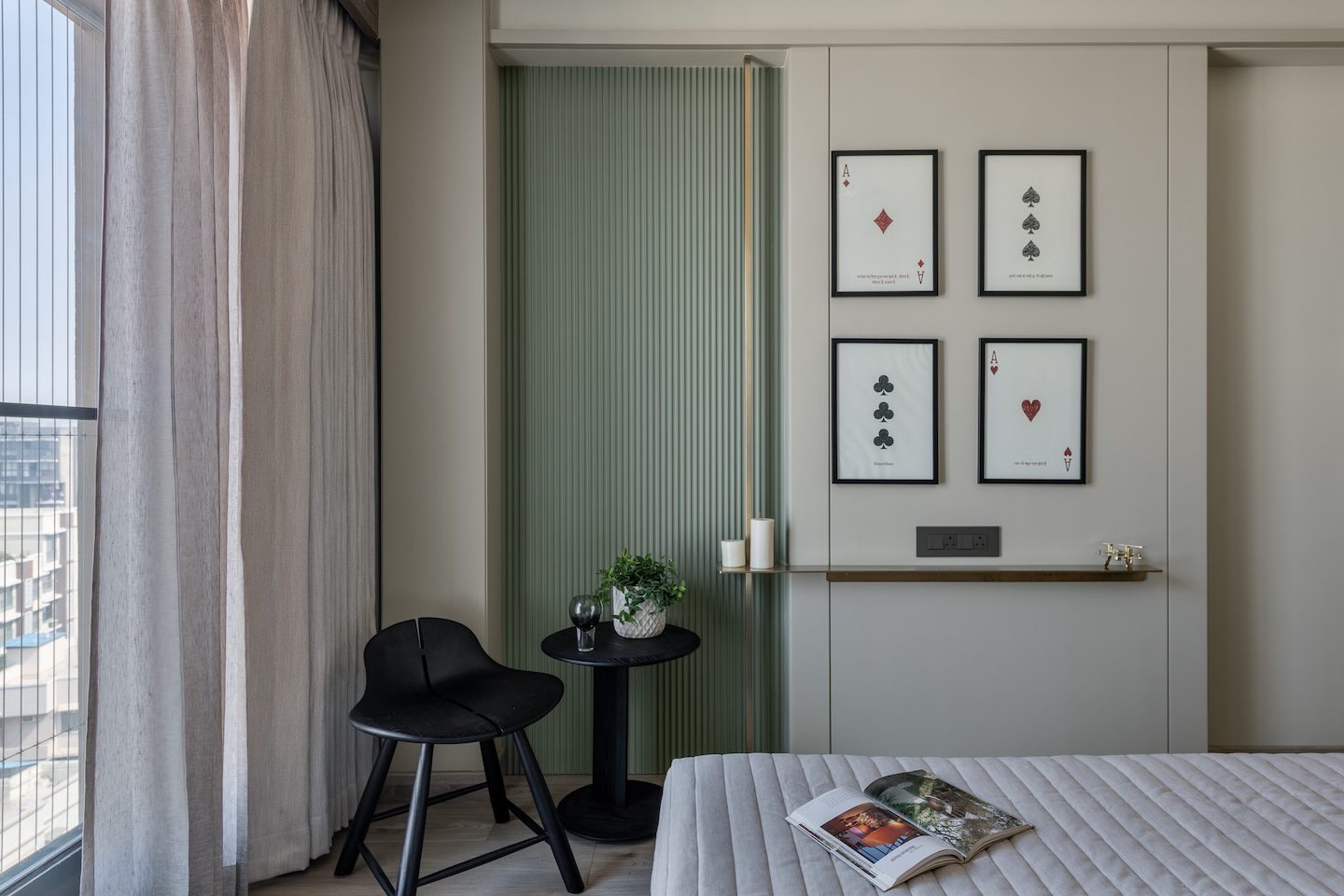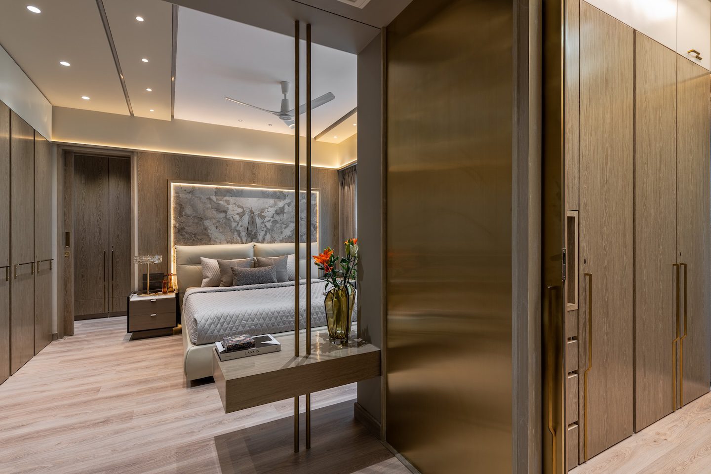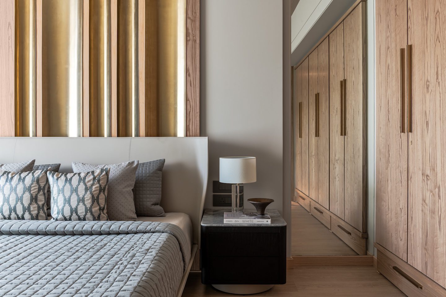 Texture and material transitions form the central theme of the project. Fluted stone walls in the dining area and rhythmic timber panelling in the master bedroom introduce layers of visual depth while maintaining overall restraint. The design carefully juxtaposes contrasting materials—stone, wood and metal—allowing each to complement the other through subtle transitions. As architect Amit Shastri explains, “True luxury lies in the transition between materials; the point where cold stone meets warm wood is where a house becomes a home.” Rather than decorative embellishment, these controlled material relationships become the primary design gesture throughout the residence.