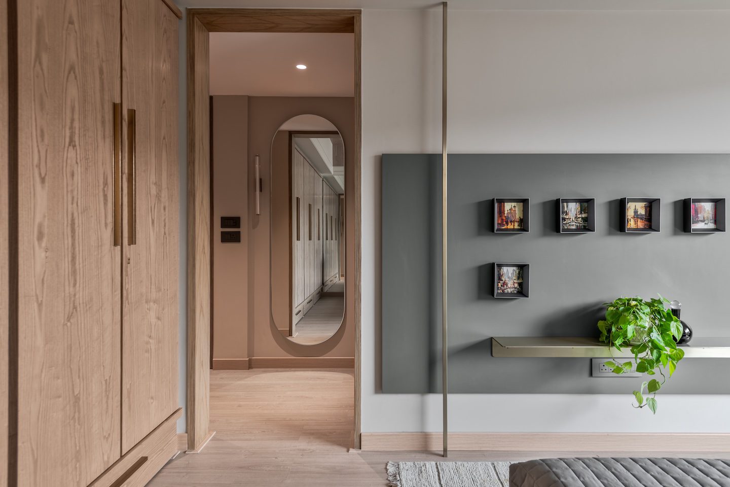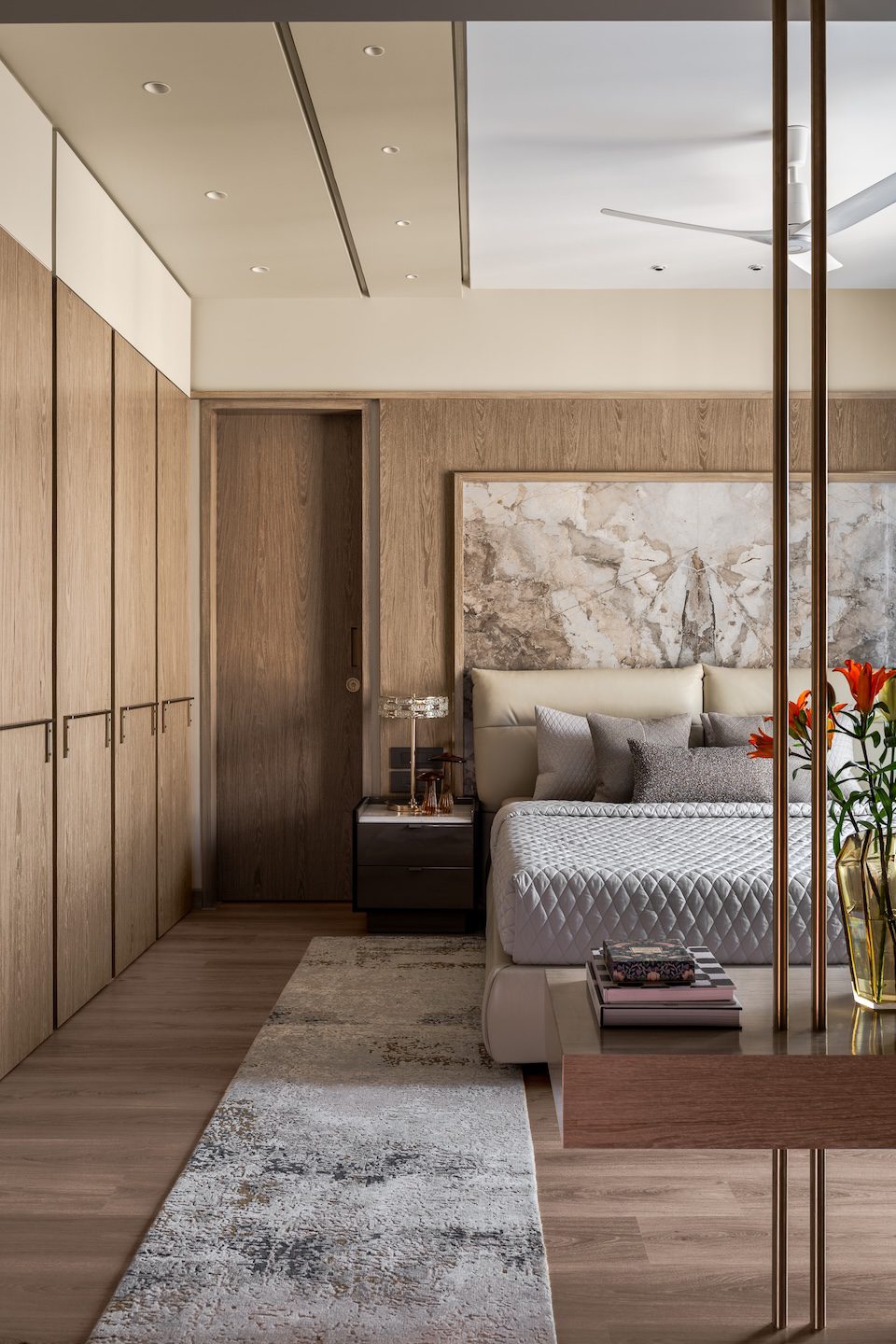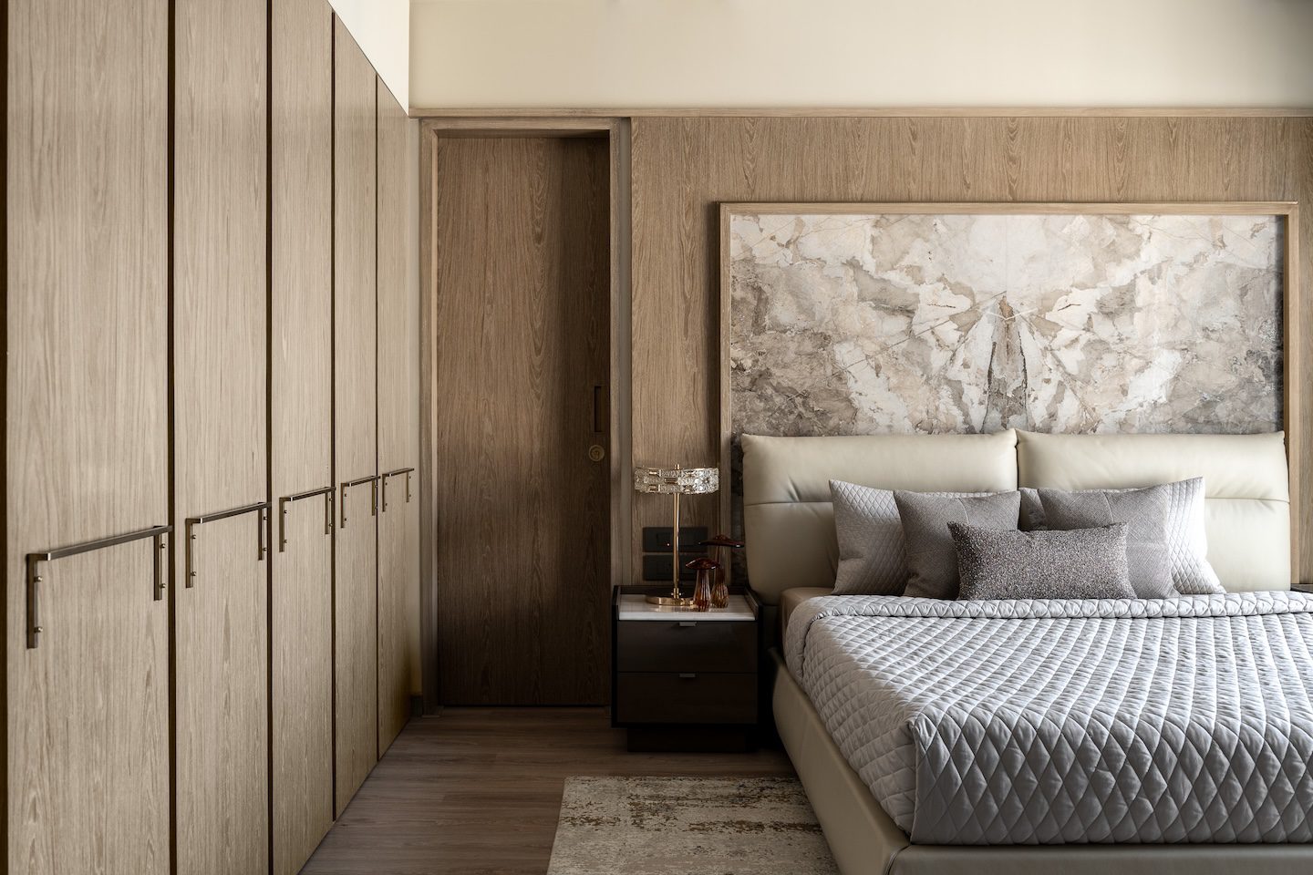 Material layering plays a defining role in shaping the interiors. Polished stone flooring and marble cladding provide a strong architectural base, softened by timber finishes and textured upholstery. Wood surfaces appear throughout the home in the form of cabinetry, wall panelling and custom-designed furniture. Bouclé fabrics and rugs introduce tactile warmth, balancing the solidity of stone. Subtle metallic accents—including slender brass elements and integrated lighting—act as refined highlights rather than decorative statements. Within the living and dining spaces, neutral seating arrangements sit against a calm material backdrop while sculptural lighting elements introduce vertical emphasis. In the master bedroom, light oak wardrobes extend floor to ceiling, creating a seamless visual plane that enhances the room’s proportions. The headboard combines stone and ribbed panelling, forming a layered backdrop that anchors the space. The washroom continues the material narrative through matte black fixtures, charcoal-toned kit-kat tiles and an asymmetrical mirror that introduces a quiet geometric gesture.