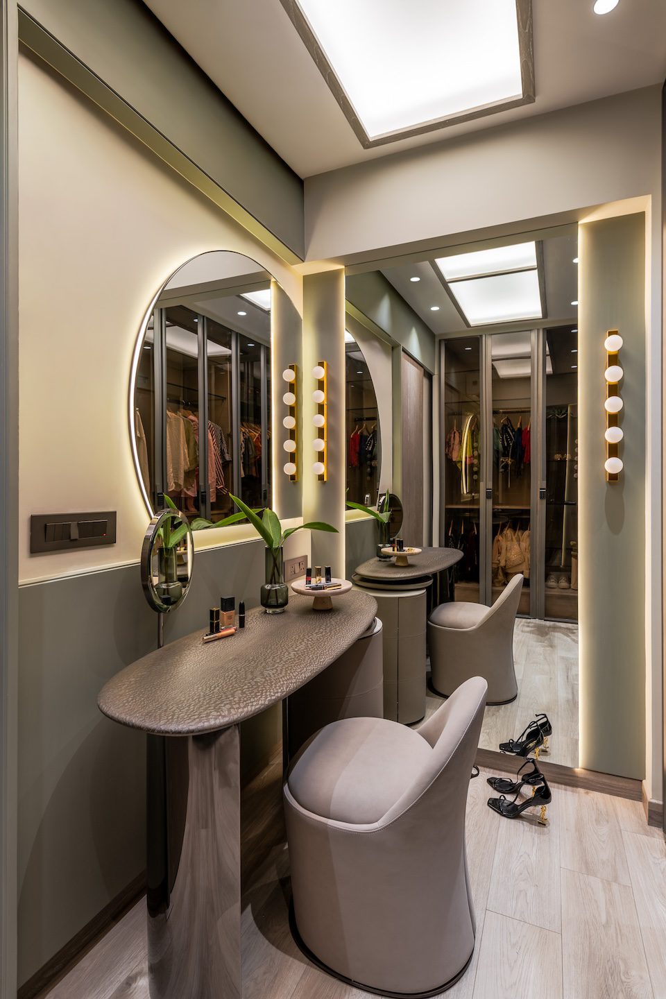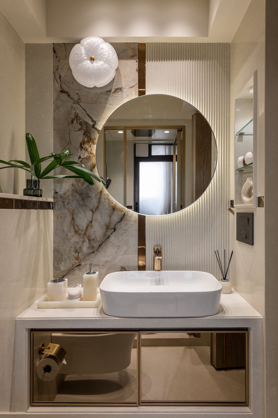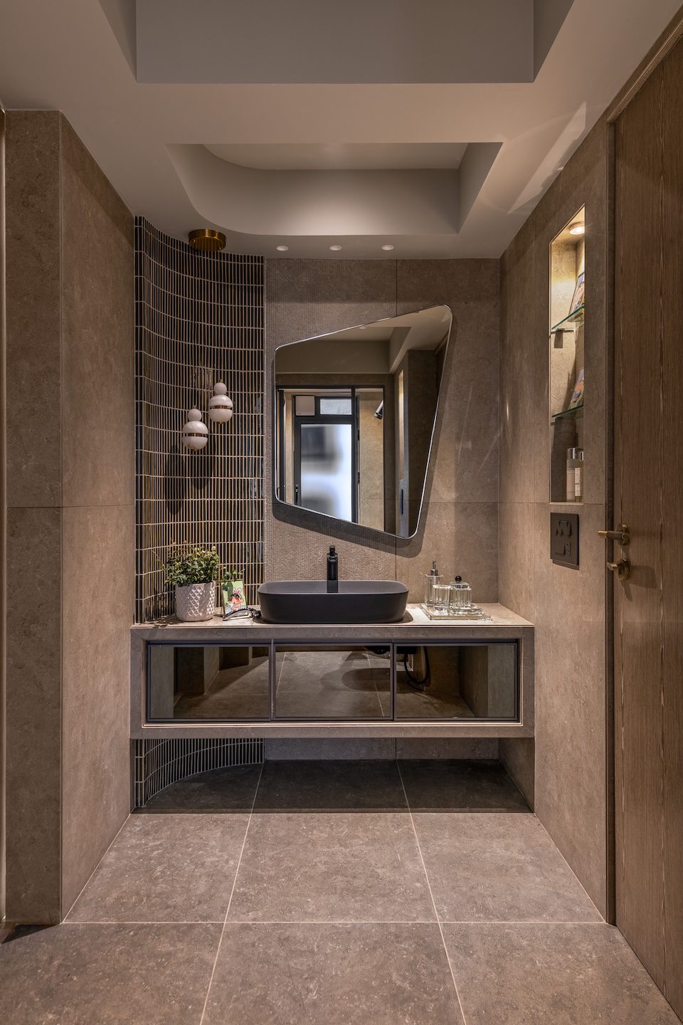 The project’s strength lies in its attention to crafted details. Cantilevered vanities and floating shelving units introduce visual lightness while allowing heavier stone surfaces to remain balanced. Elsewhere, subtle geometric interventions animate the interiors. In the washroom, a trapezoidal mirror interrupts the rigidity of stone walls, while curved mosaic corners soften the composition. These moments reinforce the project’s central philosophy—that luxury often resides in restraint and precision rather than overt display.