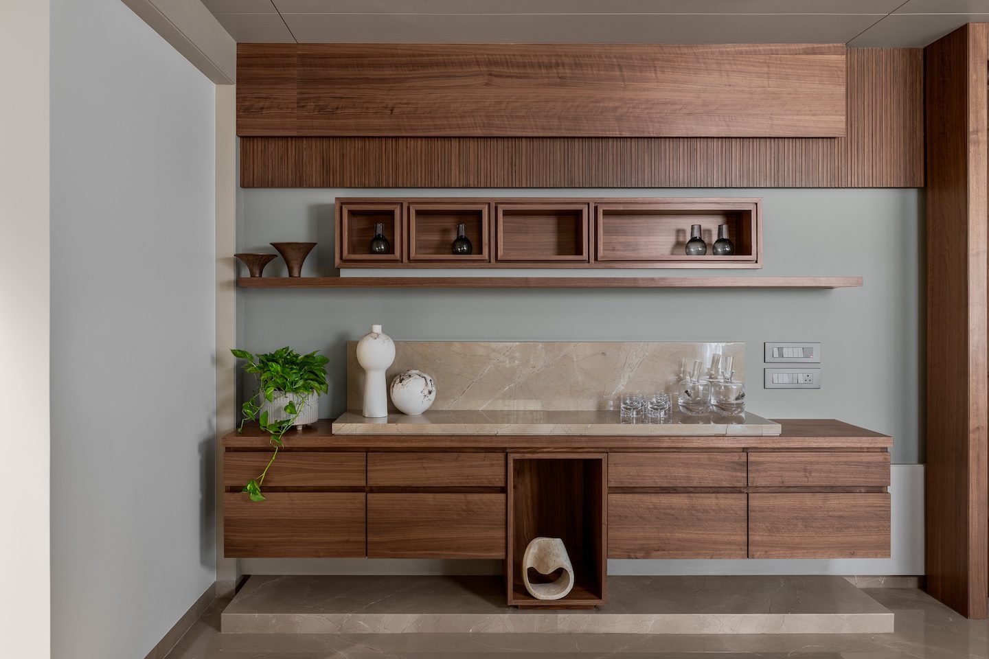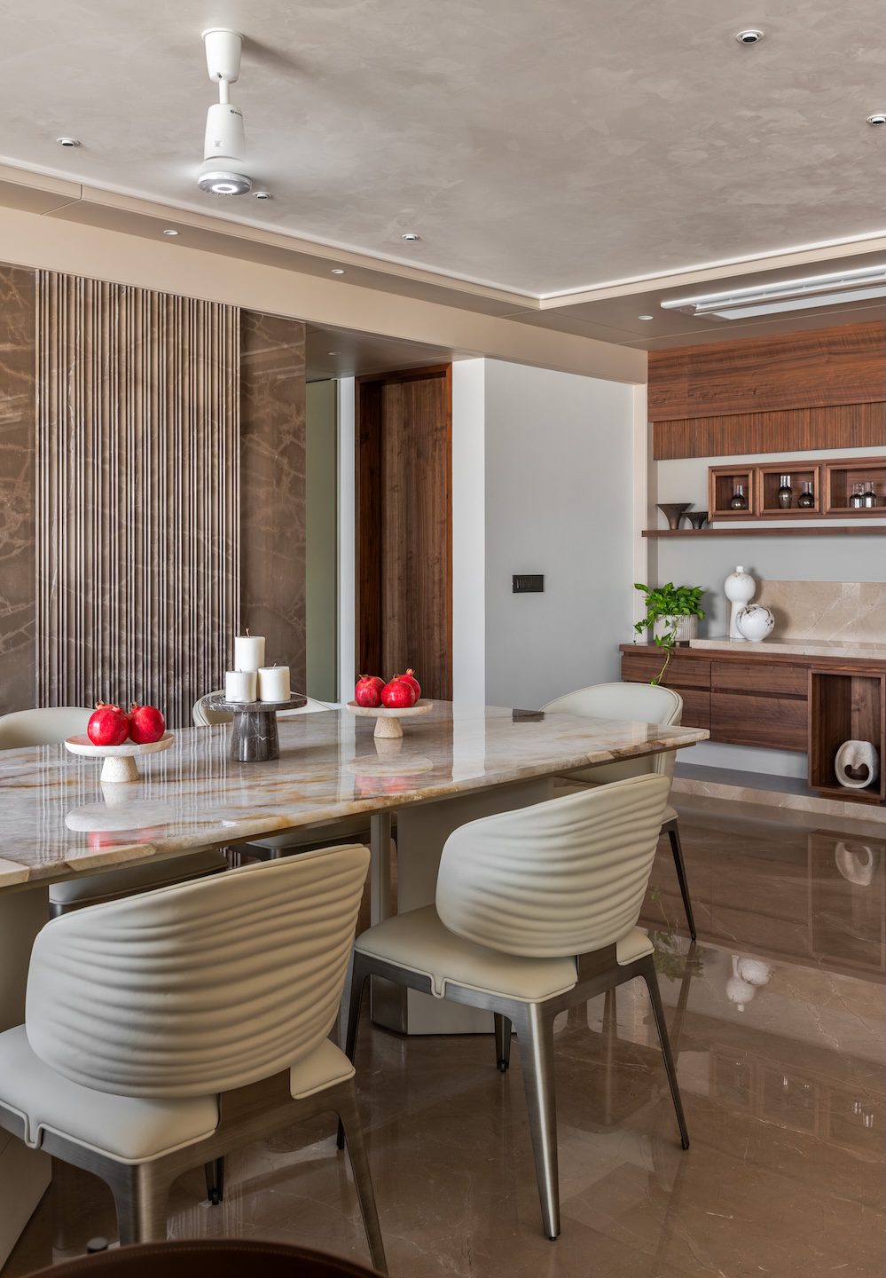 Transforming two conventional apartments into a single cohesive residence required careful spatial restructuring. Internal partitions had to be removed while maintaining structural integrity and functional efficiency. Another challenge lay in achieving the right balance between minimalism and warmth. With a palette centred on stone, timber and neutral tones, the designers worked to ensure the interiors remained tactile and inviting rather than austere.
