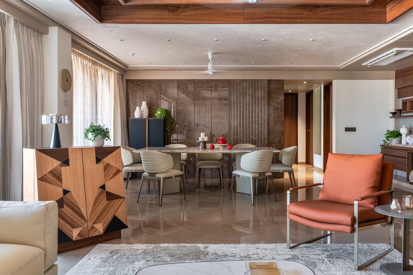 A key spatial move involved merging two existing three-bedroom apartments into a single residence. The reconfigured plan accommodates a generous four-bedroom home. Internal partitions were selectively removed to create a large open-plan living and dining space of approximately 650 sq ft. This intervention established greater visual continuity across the main living areas while allowing natural light to travel deeper into the apartment.