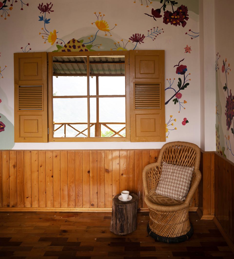 Housed behind a bright ochre door, the Secret Garden is a private dining section that enjoys surreal views of the surroundings. The pièce de résistance within this secluded nook are the walls that have been bedecked with hand-painted floral blooms to enliven snow-laden gloomy days (a composition ideated by graphic designer Anahita D’Souza and illustrated at the site by the client’s daughter Simran). An artisanal window frame in yellow has been fitted out with a mirror, creating an object of art that doubles up on the reflections of the pristine valley. This creates a lively backdrop for the low-seating configuration for patrons to gather around.