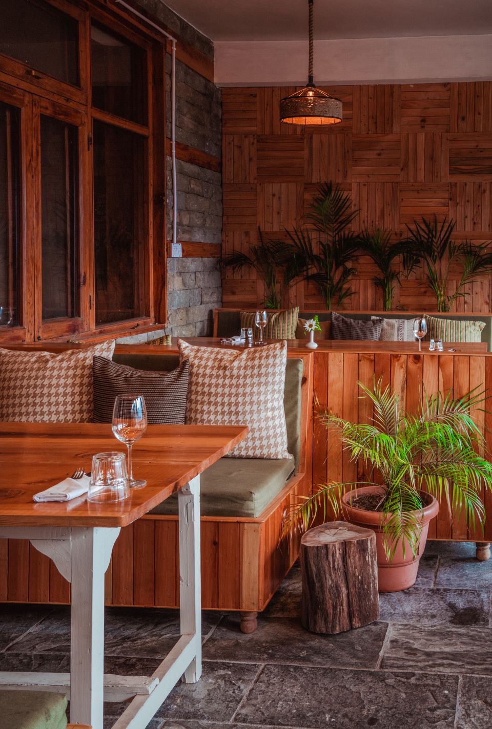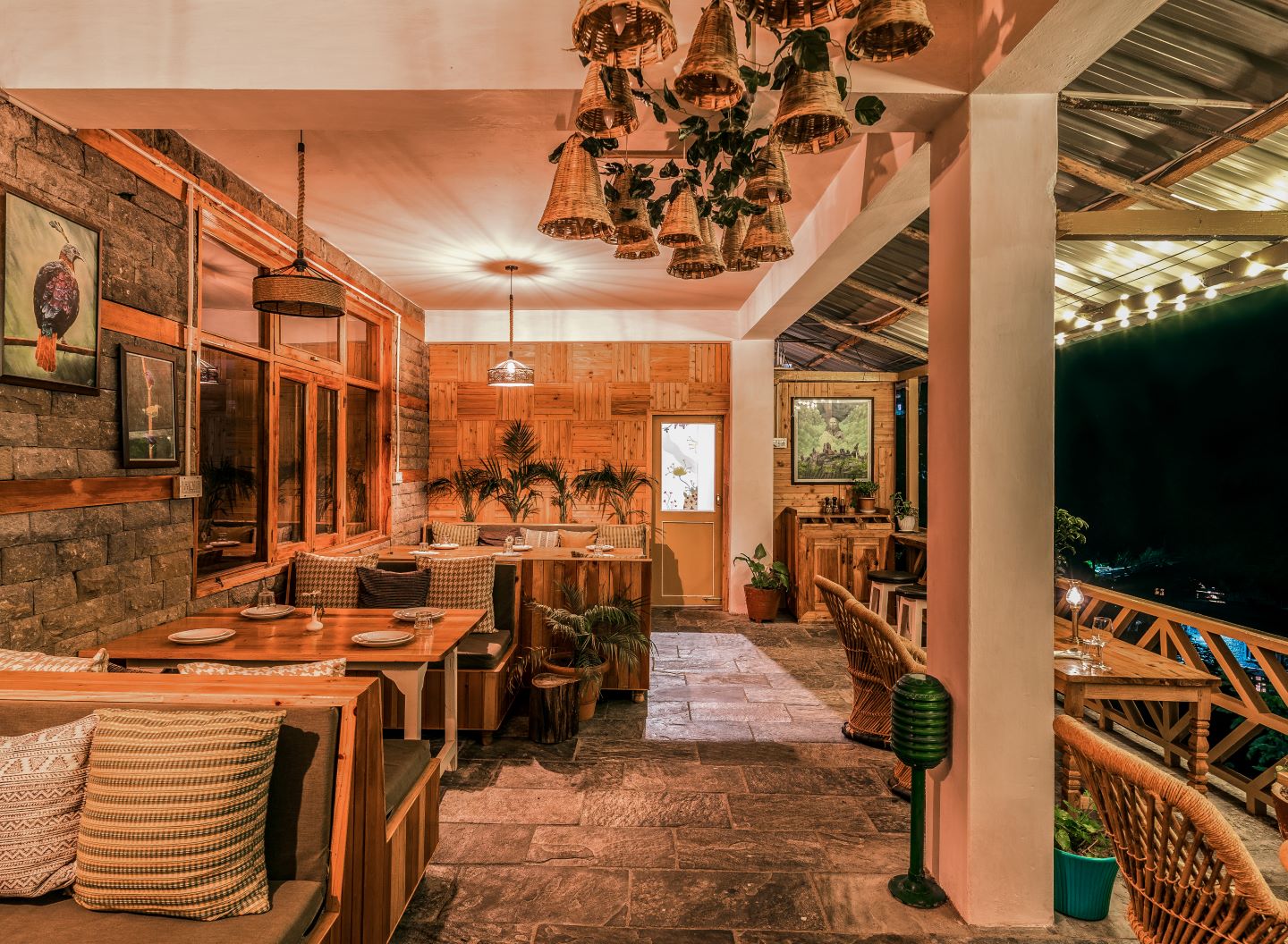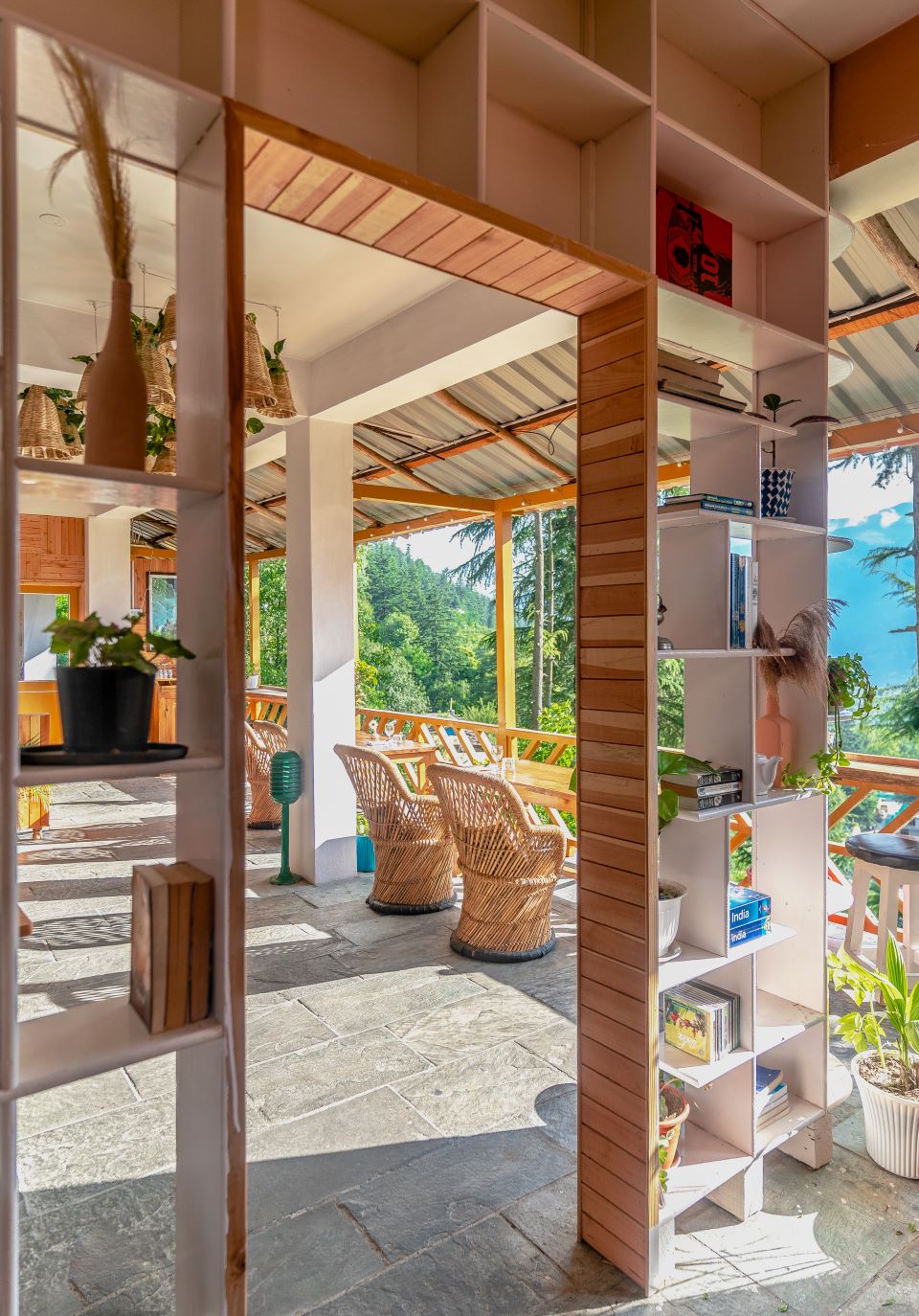 A voided geometric bookshelf cum partition system marks the entry into the outdoor section, defining the pattern of circulation. Raw and earthy materiality douses the alfresco dining area, highlighting the use of cane, jute, and natural wood in the palette. Locally bought cane chairs (mooda stools) have been oriented towards the views of the valley; they cast fleeting slatted shadows as the sun playfully traces its trajectory across the sky. Jute and cane get further carried on over to the lighting elements that crown the outdoor space, binding the visual montage. The dining booths and primary custom furniture have been finished in a collage of wooden strips with pronounced grains, a detail typical in mountain homes.