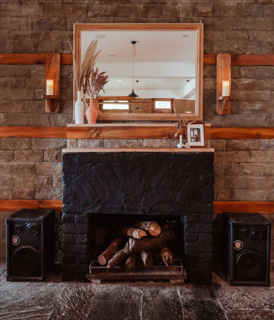 Built in brick and superimposed over a stone wall, the fireplace has been conceptualised as the hearth of the venue which rests upon the rugged charcoal slate floors. A custom wood-framed mirror rests above the wooden mantle, doubling the sense of visual volume indoors. The bar nook is earmarked by a hemispherical arched mirror lined with ebony voussoirs that recall the cafe’s visual branding as seen in their logo. Lined with a mirrored surface, the back-lit bar further amplifies the visual perception of the expanse of the bijou interiors and is neatly cordoned off by a pragmatic wooden bar counter.