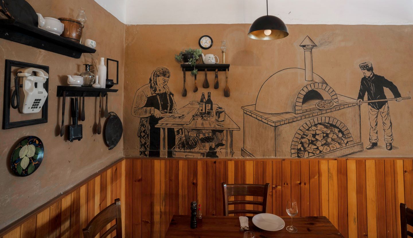 The indoor segment concocts an immersive environment that instantly evokes a sense of ingrained nostalgia and a lived-in aura. Layered with murals against the warm undulating mud walls, vintage collectables and treasured keepsakes, each element comes forth to chronicle the twenty-year legacy of this picturesque venue. A juxtaposition of three-dimensional elements across the walls adorned with hand-illustrated murals create an additional sense of dimension. Painted by local artists Jitendra Pradhan and Sanjay Thakur, the imagery depicts the owners enthusiastically labouring over the kitchen island and brick oven respectively. This visual originates from the private kitchens of the restaurant wherein a classic brick oven fires the sought-after baked goods on the menu. The walls pose as intentional canvases that recite the honest history of the venue and the hands that pieced it together. A half-wall panelling of natural wood strips lines the perimeter of the walls, imbuing the indoors with umber warmth, characteristic of hill cottages and dwellings.